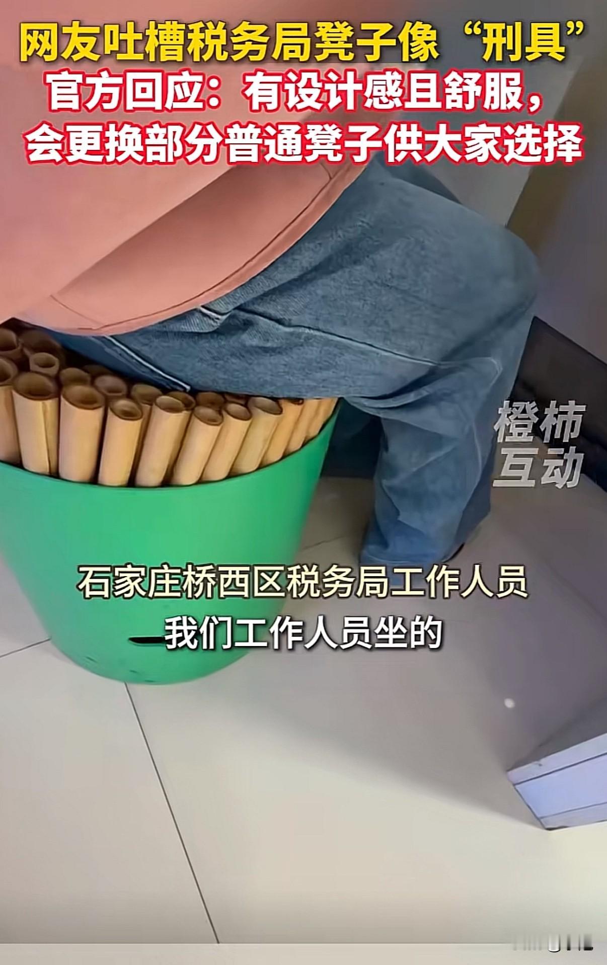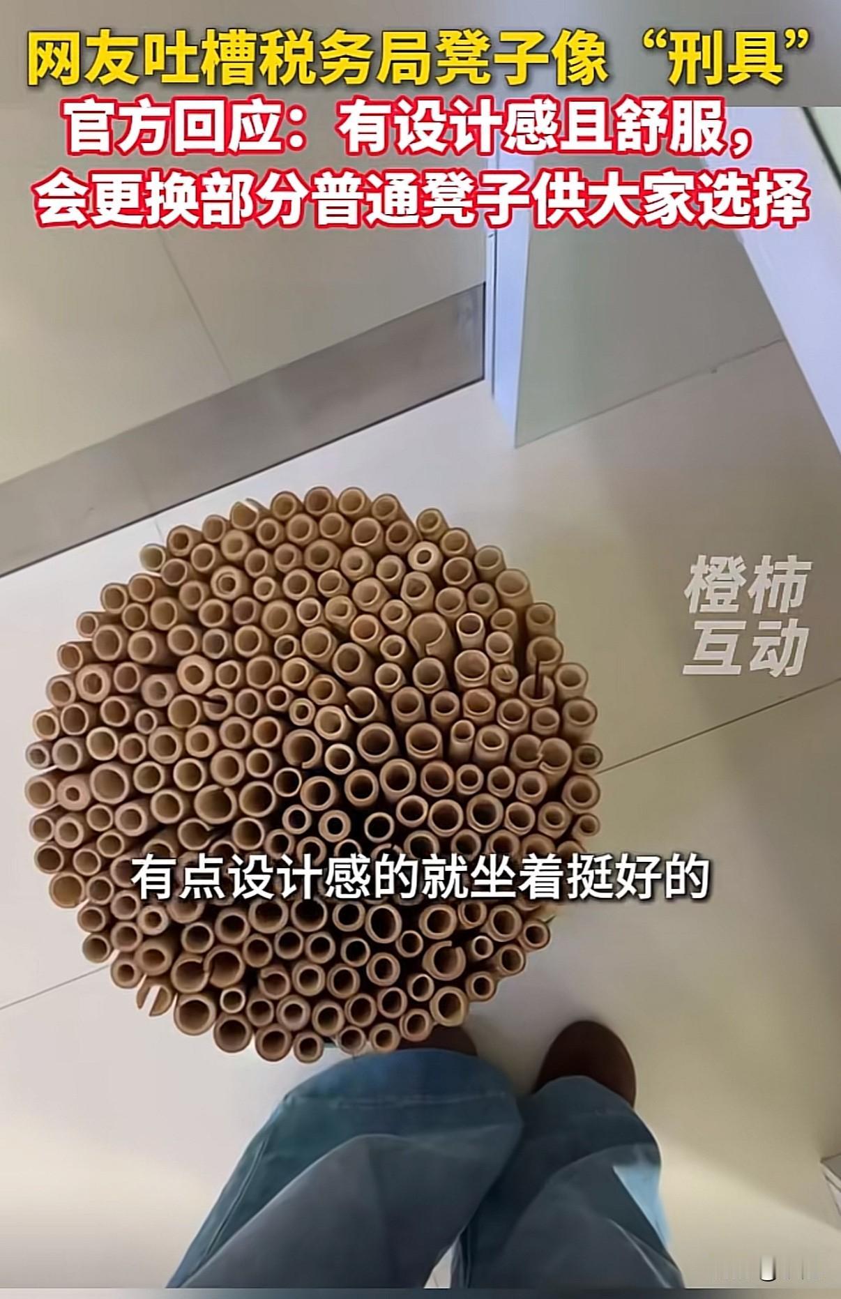 河北税务局大厅的凳子火了,因为长得太像古代刑具。 石家庄桥西区税务局,有网友去办事,一进门就被大厅的椅子惊着了。椅子面不是平的,是一根根细竹管紧密排成的,远看真有点像老电视剧里那种刑具。尤其冬天穿得厚,坐完一起身,裤子上能压出一排印子。 有人拍了照片发上网,直接说“以为是来办事的,结果像来受刑的”。话题一下就炸了。不少人调侃:“这设计是为了让群众办业务速战速决吗?”“第一次见确实吓一跳。” 税务局很快回应了。他们说,这椅子是好几年前统一采购的,本意是为了让排队等候的人坐得更舒服——竹管有弹性,对臀部有支撑,久坐不累。采购走的正规程序,价格比市面上还便宜点。而且他们强调,多数人反馈坐着确实不硌,比普通硬椅子强。 但争议没停。网友追问:“既然这么舒服,税务局的办公室是不是也配的同款?”还有人觉得,公共服务场所的家具,除了实用,也得考虑大众的心理感受。“你说再舒服,一般人看着那个造型,心里就先咯噔一下。” 最新消息是,税务局表示会换掉一部分椅子,添些普通座椅,让大家有的选。 这事挺有意思。一边是官方解释的设计理念和实用体验,另一边是老百姓最直观的视觉感受和心理反应。公共空间的设计,到底该以什么为标准?可能不单单是“坐着舒服”那么简单。 椅子终归是给人坐的。如果大多数人第一眼觉得别扭,哪怕功能再好,效果也得打个折扣。好在现在愿意调整,多一种选择,总归是好的。 不知道接下来去办事的人,会选那种“有支撑感”的竹管椅,还是普通的椅子。反正我猜,那批椅子现在肯定成了大厅里最显眼的“打卡点”。