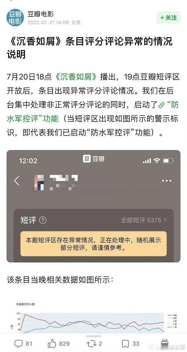 db发了关于成毅《长安二十四计》的评论异常情况的说明,处理了非正常短评4万多条而且2022年《沉香如屑》也有过评论异常的情况