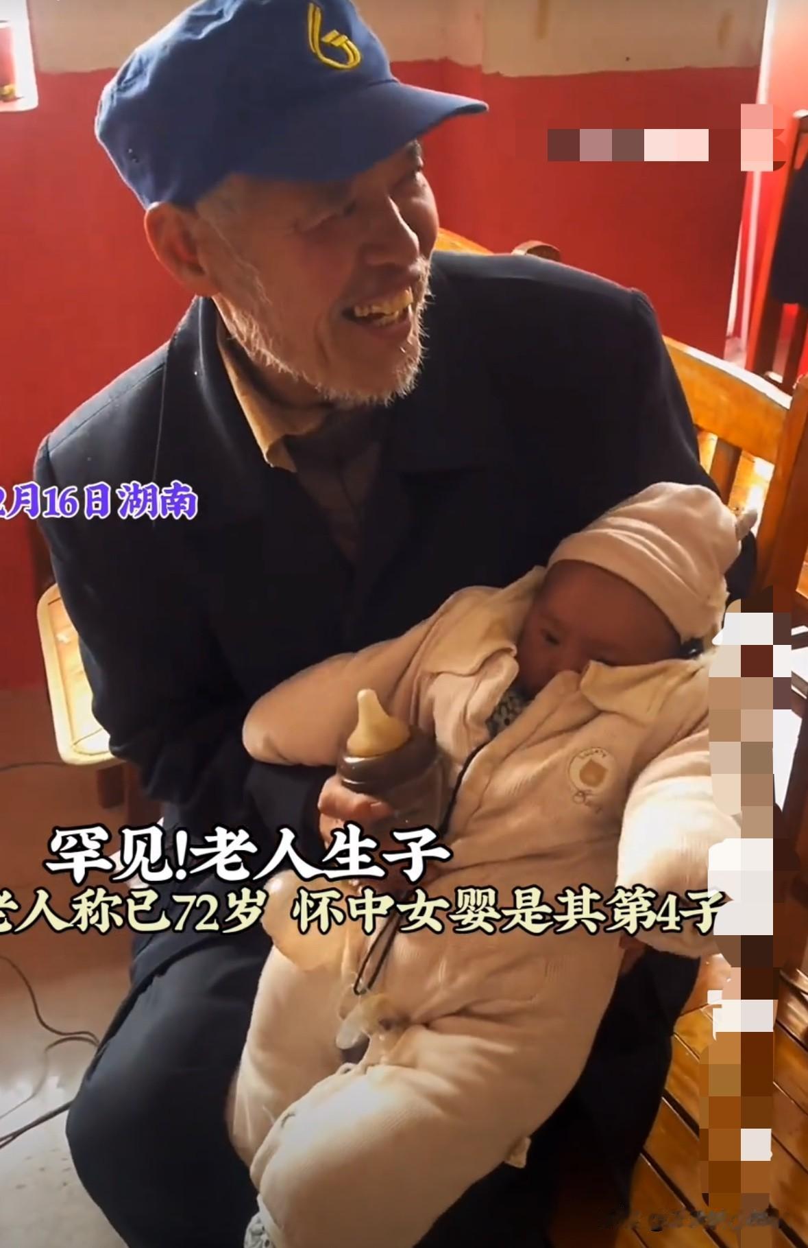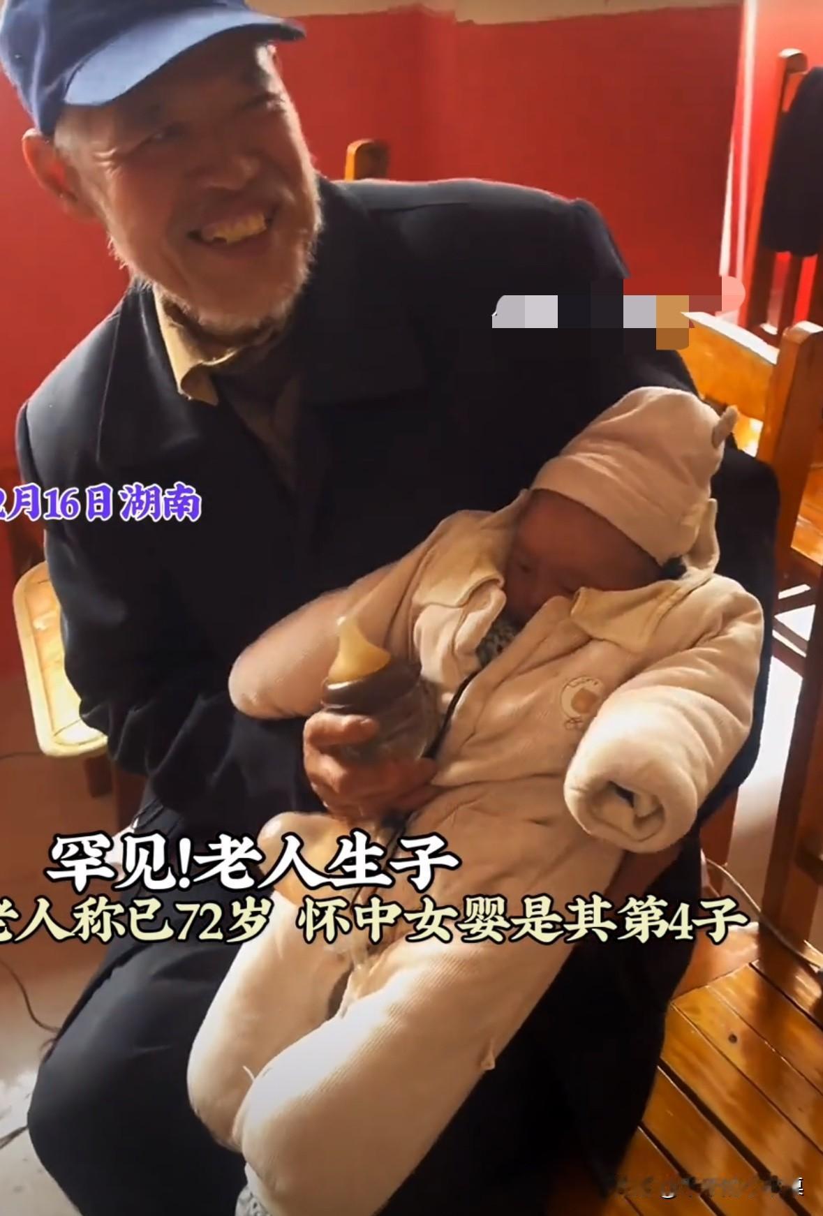 湖南72岁老人又生了一个女儿,老人开心的合不拢嘴。 看这家庭条件也不是很好,这个年龄再要孩子是对孩子的不负责。 现在都72岁了,这孩子从上学到结婚,能培养的起吗?估计结婚都看不到。 这女孩一生出来就是天崩开局,以后肯定活得很辛苦。 就算有国家补贴,三年才一万多块钱,奶粉,尿不湿钱都不够,不知道老人出于什么想法。爸爸老来得女