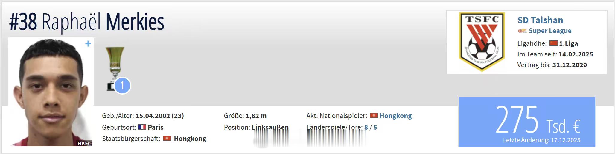 德转更新,李小恒身价为27.5万欧增涨22.5万欧。自由橙山东泰山