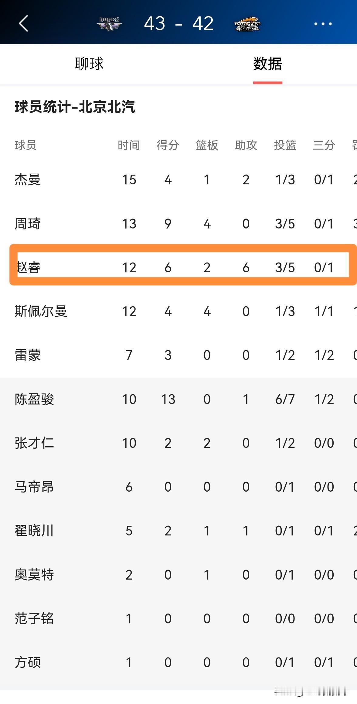北京北汽超级新援赵睿真是太强了!在今天北京北汽主场迎战辽宁本钢的上半场比赛中,赵睿首发出战12分钟,投篮5中3非常高效的得到6分2篮板6助攻1抢断,他的场上正负值为+4。 坦白说,赵睿的加盟让北京北汽的一号位实力大增,当赵睿和陈盈骏同时在场的时候,北京北汽后场组合的能力堪称CBA最强之一!!!