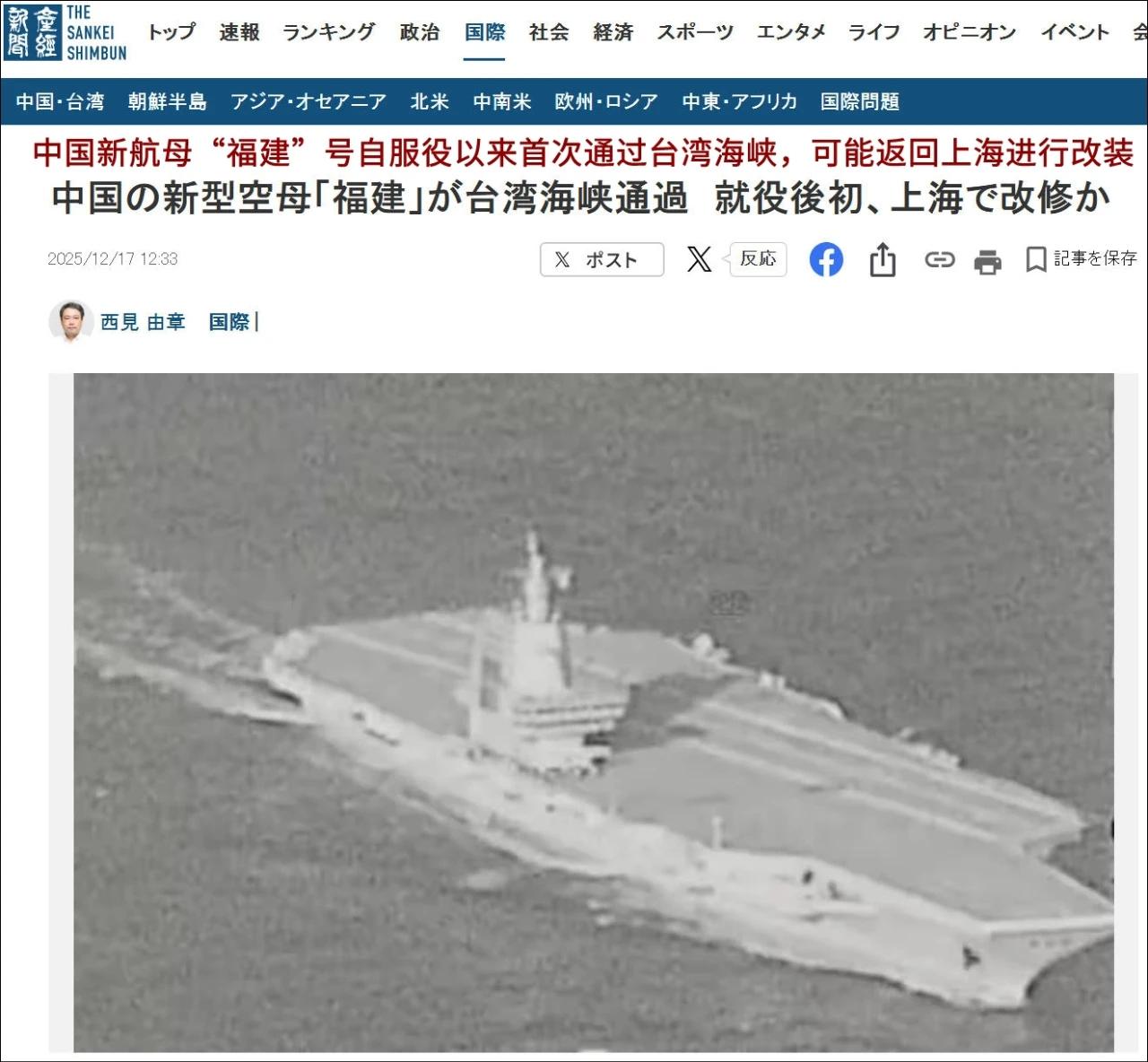 估计是前段时间日本的F-15战机被咱们的舰载机雷达照射后,心有不甘。日媒现在又开始炒作福建舰刚服役就需要紧急返厂维修。目前,福建舰已经驶过台湾海峡。过程中还被台湾的F-16拍照留念。 那这次福建舰是不是真的如日本媒体说的那样,是要返回上海造船厂紧急维修整改?个人认为不一定! 因为福建舰服役后已经开展了一次舰载机起降训练,过程非常顺利,训练圆满结束。这一次福建舰高调北上,更可能是在经过部队验证后,去接收更多舰载机,以便为下一次远洋训练做准备。 日本媒体在此刻跳出来大肆炒作福建舰服役便返厂整改,无非就是酸葡萄心理!