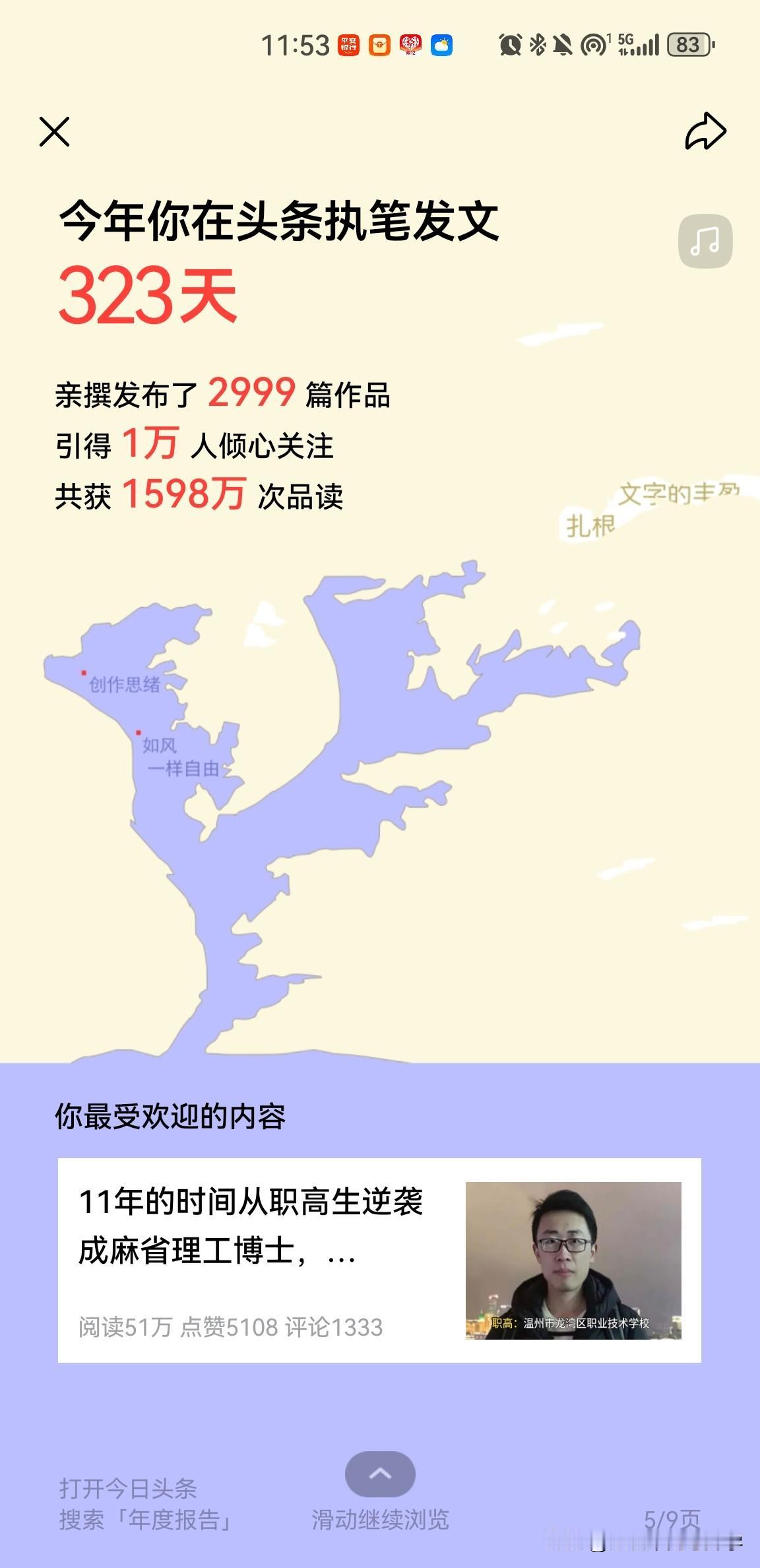 2025年我居然在头条上发布了2999篇文章 刚看到这个数据都惊呆了, 我居然发了这么多文章, 一年的时间发文章的天数是323天, 平均到每天的发文数量也超过9天一篇。 一件事做一天两天不难, 难得是长期坚持了去做, 在自媒体上写文章流量和收入都极不稳定, 能坚持到几乎每天写的更是凤毛麟角。 什么行业都有做的好的佼佼者, 当然什么行业都有浅尝辄止的参与者, 你是选择做一个长期主义的践行者, 还是做一个短期看不到希望就放弃的过路者 选择权在于你,而不在于任何人。 能坚持把一件事情重复做, 做到极致的人本身已经超越了很多人, 从一开始写头条不知道写什么, 到如今能拿到素材就文思泉涌, 这种能力就是不断重复写练就的。 至于写作的收入, 就是你不断出爆品的副产物, 但是你如果连基本的量都保证不了, 更何来的爆款文章呢? 头条大咖九边pro和素老三的文章我经常看 佩服他们把任何小事都能融入自己的思考, 这本来就是不容易的事情, 毕竟能有自己的观念,能独立思考, 就是区别普通人的重要标志!