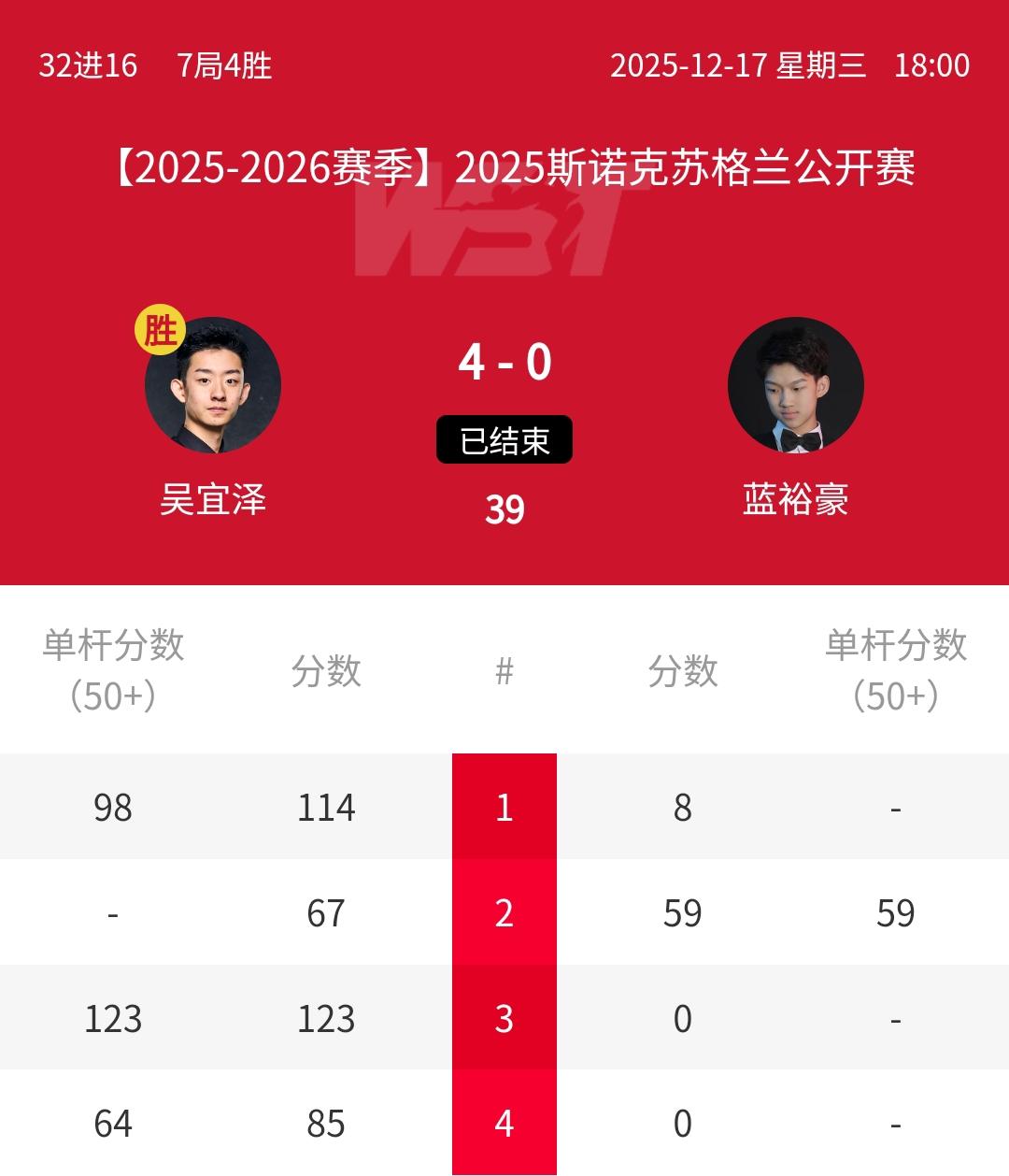 4-0赢中国德比,轰123+98+64分,国锦赛冠军吴宜泽轻取职业赛新人!刚刚结束2025年斯诺克苏格兰公开赛第二轮的一场中国德比战中,备受关注的国锦赛冠军吴宜泽状态神勇,在与职业赛新人蓝裕豪的比赛中1,他轰出一杆破百和两杆50+,总比分4-0横扫晋级16强,他也是第一位晋级16的球员,祝贺吴宜泽!整体来看,以吴宜泽尽目前的状态,争冠态势非常明显!丁俊晖 赵心童