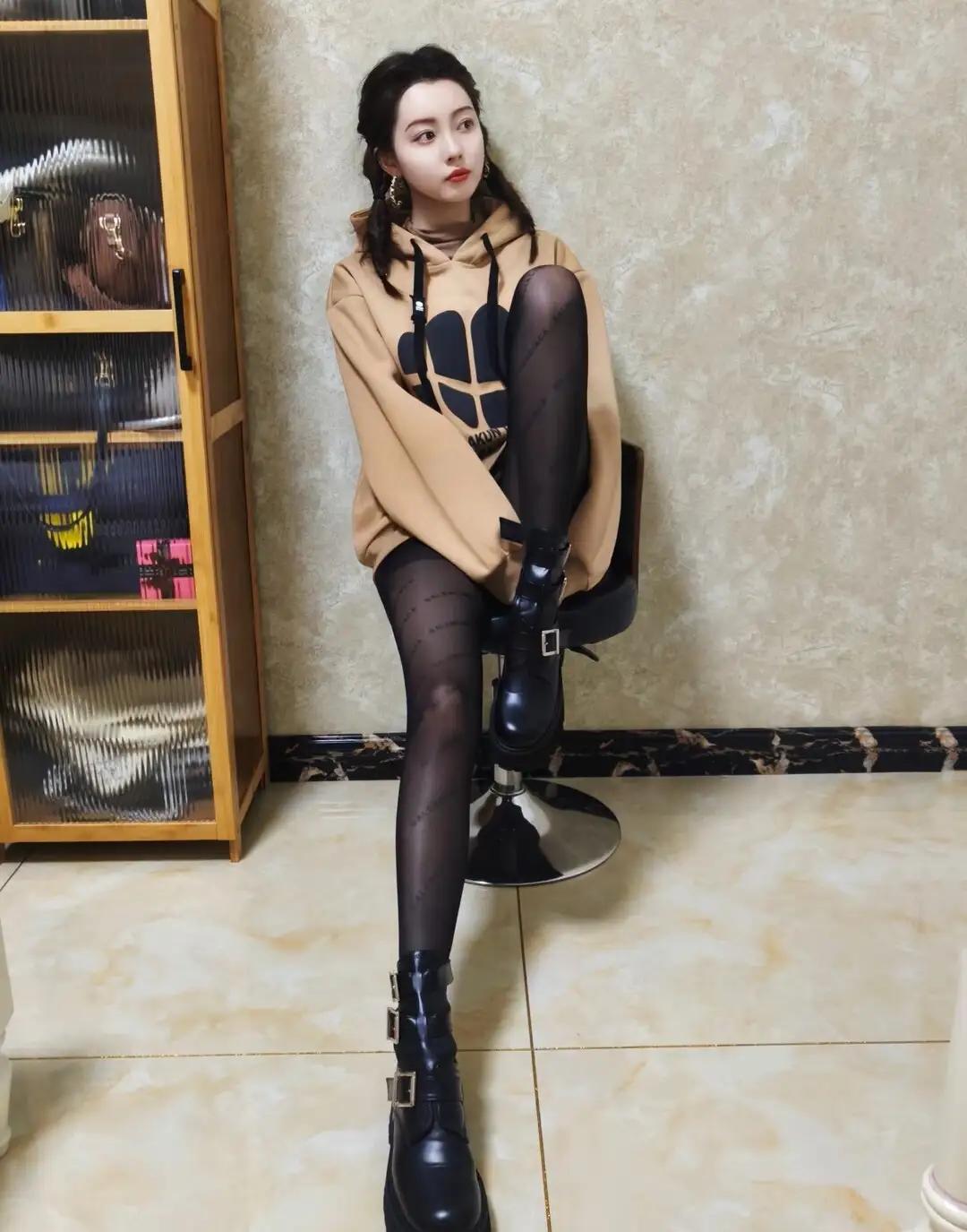 时尚穿搭指南:米色卫衣+黑色丝袜+酷炫靴子,轻松出街!