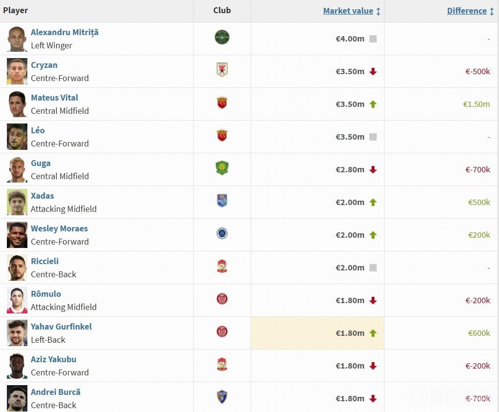 德转更新身价榜,中超球员身价榜前十,全部是外援,其中浙江队外援米特里策以400万欧居首,克雷桑下跌50万欧、维塔尔上涨150万欧、莱昂纳多与去年持平,三人都是身价350万欧,并列第二。 那么德转这个身价的依据是什么?谁说了算。莱昂纳多身价没有上涨,维塔尔身价却涨了150万欧,总感觉哪里不合理。 北京国安的法比奥,山东泰山队的卡扎伊什维利、泽卡,均不在中超前十名之内。