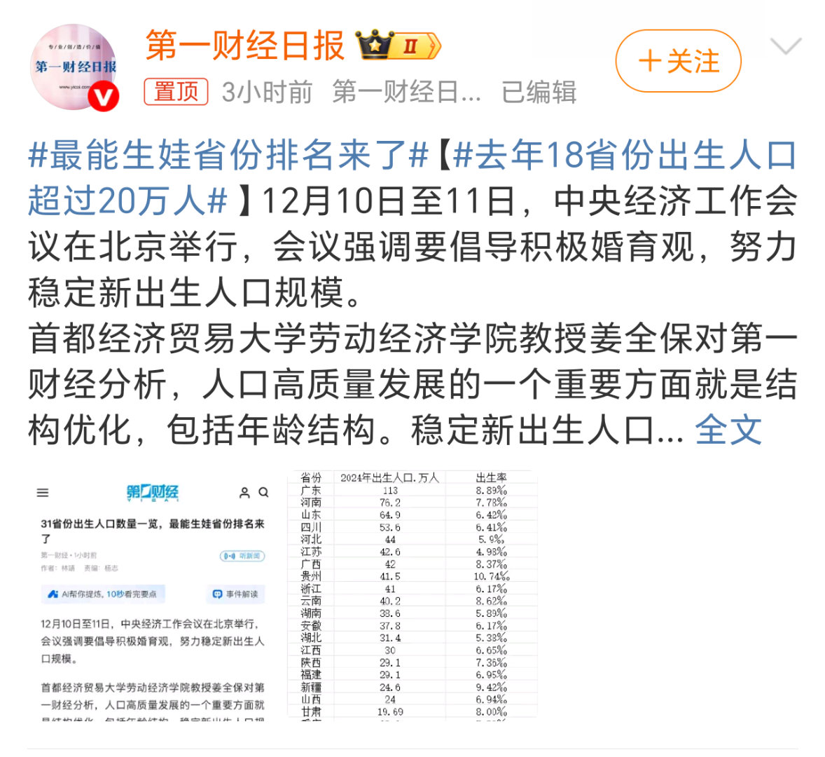 最能生娃省份排名来了今天这俩热搜算是呼应上了,一边告诉你都有哪些地方能生娃,一边又告诉你明年生娃基本不用花啥钱,没有啥负担了。总结一句话就是,赶紧都给我多生,越多越好明年生娃基本不用再花钱