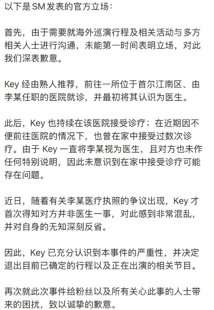 金起范就非法注射风波道歉 近日,SHINee 成员 KEY(金起范)就卷入 “非法注射” 风波一事,通过个人社交平台发布手写信致歉,回应公众关切。致歉文中,金起范首先就相关争议引发的担忧,向粉丝及大众表达诚挚歉意。
