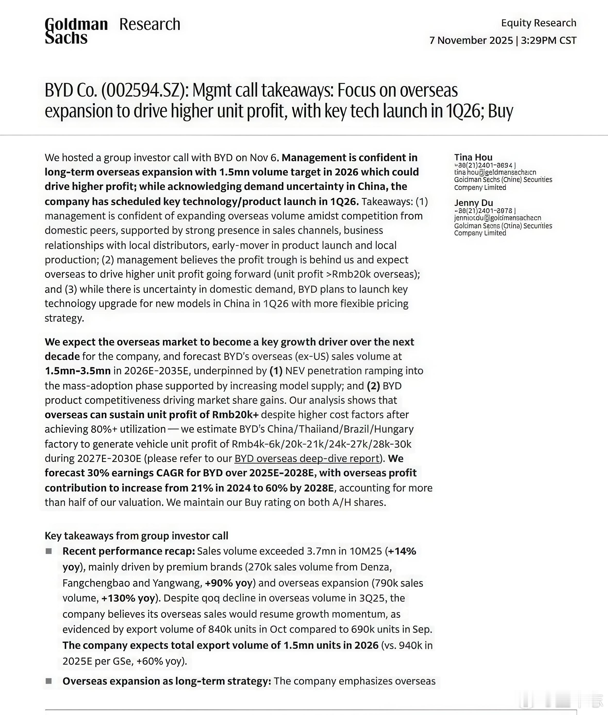 在汽车行业竞争加剧、市场情绪整体偏弱的背景下,比亚迪却持续获得高盛、花旗、摩根士丹利等国际机构看好。比如,高盛在 11 月发布的研究中,明确把海外市场作为比亚迪未来十年的核心增长来源。花旗则在 11 月将比亚迪纳入 90 日正面催化观察名单,判断随着新车型周期启动和行业库存逐步消化,比亚迪在国内市场的表现仍具稳定性和持续性。摩根士丹利的判断集中在规模与执行能力上,其研报中多次提到比亚迪海外销量的潜在增长空间,。而以方舟投资为代表的长期资金,10 月中下旬通过旗下基金连续增持比亚迪股份。在行业承压和分化加剧的阶段,具备规模、技术和全球化体系能力的车企更容易被识别。国际资本集中看好比亚迪,本质上是对其长期发展路径和产业位置的认可。