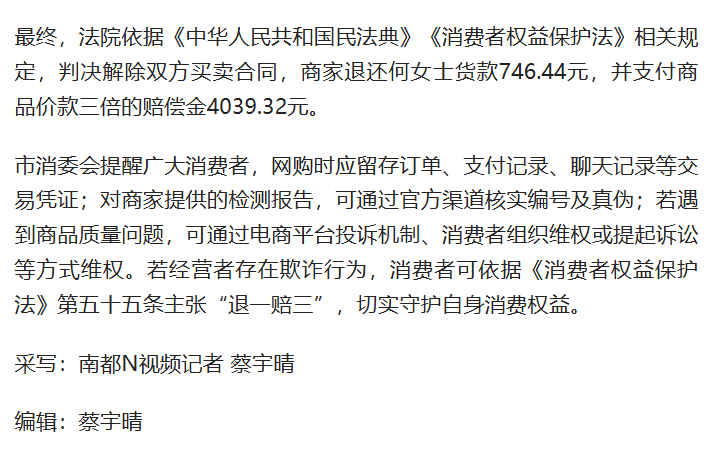 #网购靠椅甲醛超标商家P图造假#【网购靠椅甲醛超标,商家伪造报告涉嫌欺诈被判“退一赔三”】网购靠椅异味难消,商家出示的“合格检测报告”竟系伪造。近日,经深圳市消费者委员会协助维权,这起网络购物消费欺诈案尘埃落定,法院判决商家退还消费者部分货款并支付三倍赔偿金,切实维护了消费者合法权益。2025年3月底,消费者何女士在淘宝“金某办公家具工厂”花费1346.44元购买3张靠椅,收货后发现产品存在明显异味,长期不散。何女士向商家反馈后,对方称异味属“出厂正常情况”,并提供了一份标注“检验结论:合格”的检测报告,拒绝退款。协商无果后,何女士向深圳市消委会提起投诉。市消委会介入调查后发现,商家提供的检测报告与“国家家具产品质量检验检测中心(江西)”官网查询到的对应编号报告结论严重不符,原报告明确标注甲醛释放量“不合格”,商家涉嫌通过P图篡改报告结果。鉴于证据确凿,市消委会协助何女士提起诉讼。法院审理认为,商家明知商品质量不合格,仍伪造检测报告虚构合格事实,故意隐瞒真实情况,已构成消费欺诈,同时案涉商品不符合质量标准,导致合同目的无法实现,构成根本违约。最终,法院依据《中华人民共和国民法典》《消费者权益保护法》相关规定,判决解除双方买卖合同,商家退还何女士货款746.44元,并支付商品价款三倍的赔偿金4039.32元。