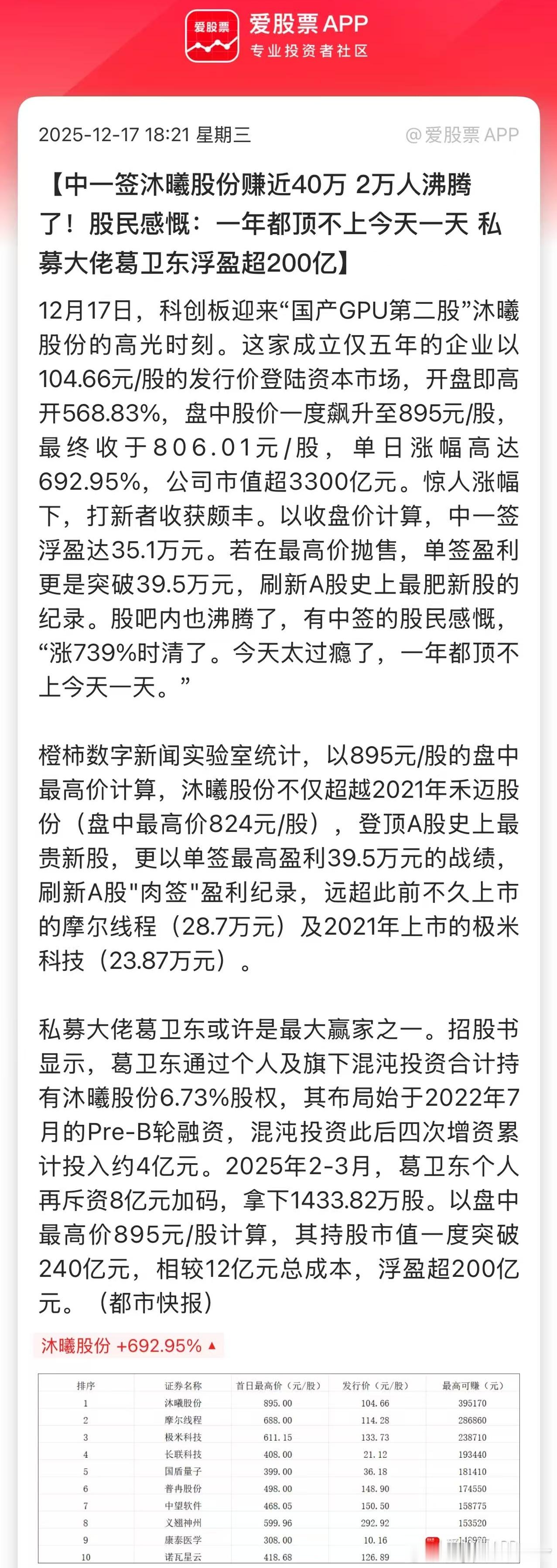 中一签沐曦股份赚近40万 2万人沸腾了!股民感慨:一年都顶不上今天一天私募大佬葛卫东浮盈超200亿葛卫东一把就赚大了