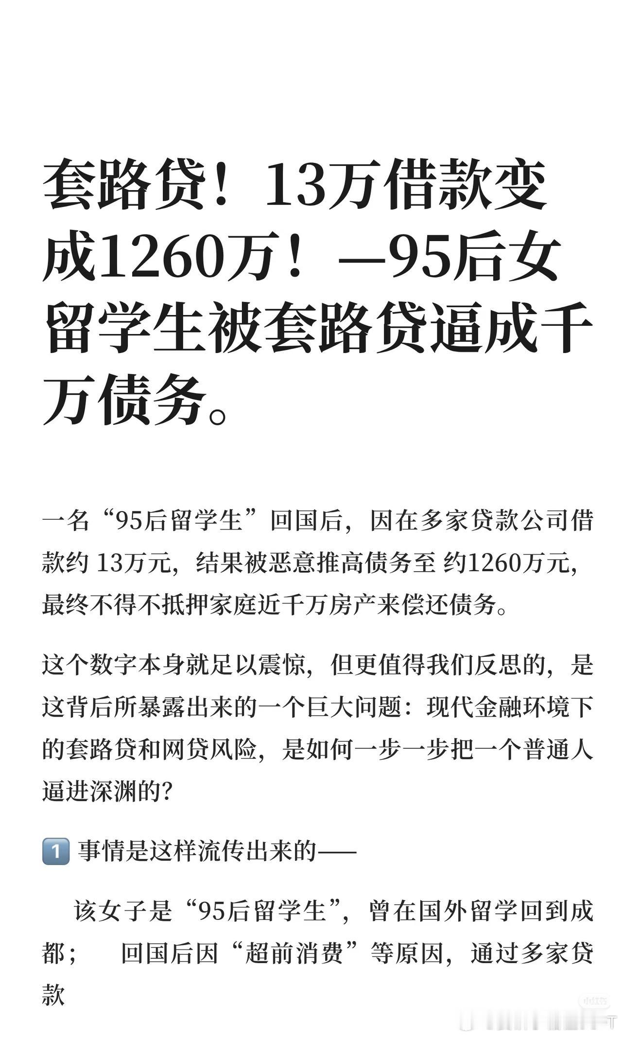 警惕新型套路贷!女子借款13万一年半内滚到近1300万! 成都叶女士为周转借款13万元,落入犯罪团伙“套路贷”陷阱,短短1年半债务竟被恶意垒高至1260万元,被迫抵押三套房产。 团伙精准掌握其征信与房产信息,以“低息贷款+固定租金收益”为饵,诱签三份暗藏杀机的合同:看似合规的13万借款合同(月息1.5%)、承诺月付2.3万租金的托管合同、藏有“违约需付年租金30%违约金”的授权委托书。 他们先扣砍头息,让叶女士实际到手仅10.4万元;再虚构“群租房无法出租”理由索要高额违约金,继而诱导“借新还旧”转单平账,将利息、违约金计入本金,最终把债务滚成天文数字,甚至企图通过仲裁强制执行拍卖房产。 这正是新型套路贷的典型操作——褪去暴力催收的粗暴外衣,披上合规资质的“合法马甲”,把仲裁、诉讼等司法程序变成侵吞财产的工具,实现“合法”吸血的闭环。 这类犯罪专盯有房产、急需周转却被正规金融渠道拒之门外的年轻群体,精准狩猎、层层设套,杀伤力极强。 监管需补漏洞,公众更要守住“不轻信、细审合同、不碰以贷养贷”的底线。 对我们而言,更要牢记三大底线:不轻信“低息无门槛”的贷款诱饵,细审合同每一项条款尤其是违约金、授权委托内容,坚决不碰“以贷养贷”的续命陷阱。一旦发现异常,立刻止损并报警维权。 希望监管层面需强化对租赁、小贷等关联行业的穿透式监管,堵住信息泄露和仲裁滥用的漏洞!