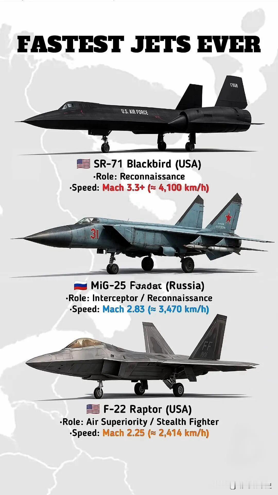 世界上飞行速度最快的飞机是美国洛克希德·马丁公司“臭鼬工厂”生产的SR-71“黑鸟”高空侦察机。该机1963年2月开始研制,1964年12月首次试飞,1966年1月交付使用,飞行速度超过3.3马赫,堪称人类航空史上的奇迹。 美军侦察机 黑鸟超音速飞机 军事 军迷发烧友 武器装备 侦察机