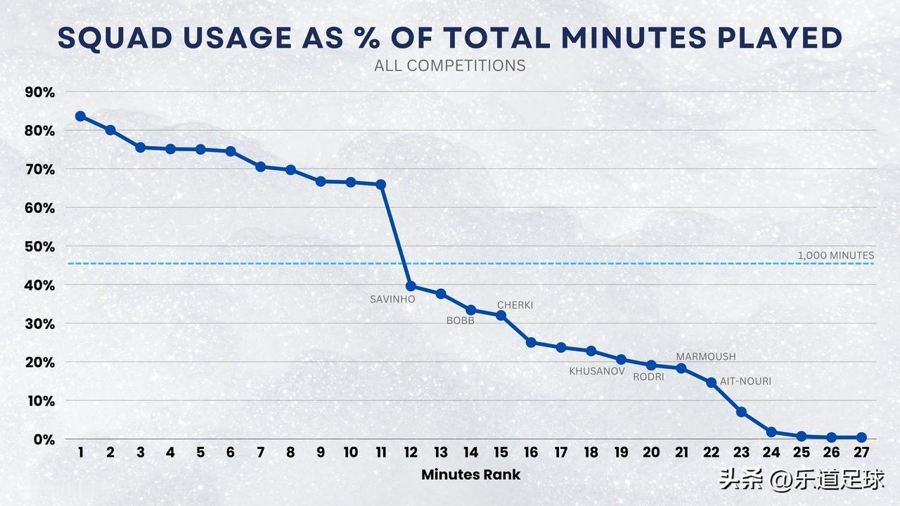 未来一个月欧冠及英超密集赛程将是考验医疗团队和阵容韧性的关键期。 本赛季曼城没有球员被“过度使用”,全队无人出场时间超过总比赛时长的90%。 哈兰德(83.6%)和迪亚斯(80.0%)是最接近这一比例的球员。 目前球队常规首发球员与轮换球员之间存在明显分界线,但正如数据所示,未来几个月完全有足够多球员能够填补这一差距。 此外,伤病也是导致部分球员本赛季出场时间不足的重要因素。