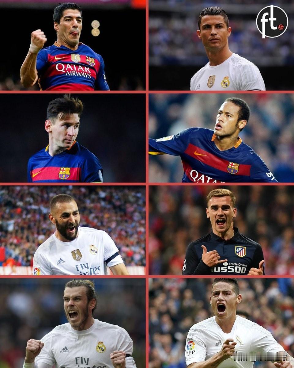 2015/16赛季西甲联赛部分球员的数据: 🇺🇾 苏亚雷斯(巴塞罗那)——40球18助攻 🇵🇹 C罗纳尔多(皇家马德里)——35球11助攻 🇦🇷 梅西(巴塞罗那)——26球16助攻 🇧🇷 内马尔(巴塞罗那)——24球16助攻 🇫🇷 本泽马(皇家马德里)——24球8助攻 🇫🇷 格列兹曼(马德里竞技)——22球6助攻 🏴 贝尔(皇家马德里)——19球11助攻 🇨🇴 罗德里格斯(皇家马德里)——7球8助攻 梅西的突破与世界波,C罗的凌空抽射与帽子戏法,格列兹曼的精准射门……,每一个进球都让球迷热血沸腾,每一次破门都刻画了那个时代的足球美学。 那是西班牙足球的巅峰时代。