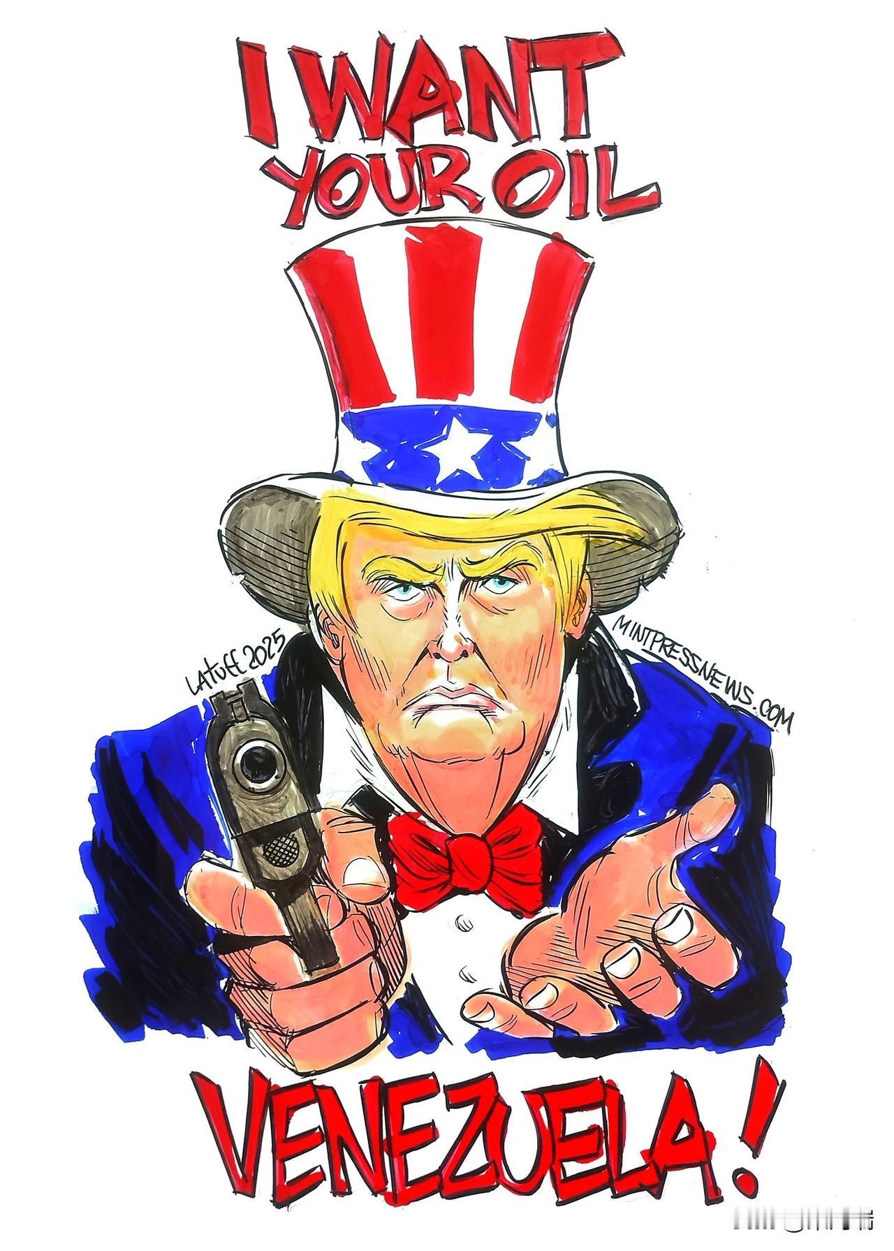 当年美国入侵伊拉克的借口是“反恐战争”。现在,特朗普又想以“禁毒战争”为幌子攻击委内瑞拉。但归根结底,伊拉克和委内瑞拉的利益都是一样的:石油! 这幅漫画是巴西漫画家卡洛斯·拉图夫(Carlos Latuff)为 MintPress News 创作的一幅政治漫画。 这幅漫画批评了美国对委内瑞拉的态度,暗示美国对委内瑞拉石油储备(委内瑞拉拥有世界上最大的已探明石油储备)感兴趣,而“反恐战争”或“禁毒战争”等借口只是为了干预的幌子。 漫画将美国总统唐纳德·特朗普(Donald Trump)描绘成山姆大叔(Uncle Sam)的形象,这是一个标志性的美国国家象征,通常用于招募海报,强调美国政府的意图。 漫画顶部的文字“I WANT YOUR OIL”(我想要你的石油)和底部大写的“VENEZUELA!”(委内瑞拉!)明确表达了漫画的核心信息,即美国的干预是出于对石油的欲望。
