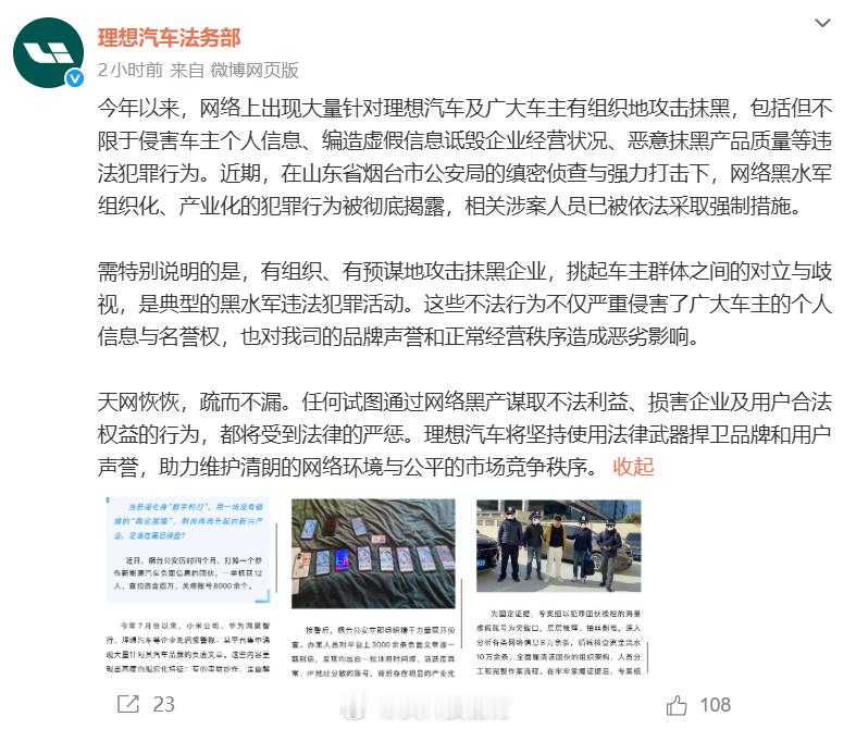 【小米、鸿蒙智行、理想相继报警 12人被抓!理想回应被水军抹黑】烟台公安通报破获的新型网络水军案件,今年7月份以来,小米公司、华为鸿蒙智行、理想汽车等企业先后报警称:某平台集中涌现大量针对其品牌的负面文章。最终查获12名犯罪嫌疑人。理想法务部表示,将坚持使用法律武器捍卫品牌和用户声誉。