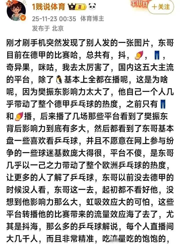 广场舞阿姨的手指,刷着刷着就滑进了樊振东德国比赛的直播间。 她们发“小胖加油”的弹幕,比分享养生帖还熟练。这不是体育圈的事,这是一次流量的“意外跳闸”。三大平台砸钱抢转播权,你以为他们在抢球迷?错了,他们在抢你的阿姨。联想和李宁的广告,精准插播在局间休息,瞄准的是刚刚学会线上支付的那批新用户。 数据不会骗人。小红书“同款球拍”搜索暴涨320%,45岁以上用户占了近三成。微博热搜上,阿姨们的二创助威视频,播放量碾压专业集锦。国家“体育+数字”的政策刚下发,一个打乒乓球的男孩,已经用球拍撬开了中老年数字生活最硬的那块壳。 这背后的密码就一句:阿姨们追的不是球,是渴望活得“热气腾腾”的自己。她们在樊振东稳准狠的回球里,照见了自己未被磨损的生命力;在统一的弹幕口号里,找到了失散已久的集体共鸣。平台和资本只是顺势而为,破译了这场集体潜意识里的“青春返场”。 所以,别再问乒乓球为什么火了。火的不是运动,是亿万普通人对抗数字孤岛与年龄焦虑的冲锋号。当你的母亲开始为你解释什么是“反手拧拉”,时代已经翻页——**她们追的不是球,是不被时代推走的参与感;她们抢的不是票,是数字世界里一个热气腾腾的座位。**