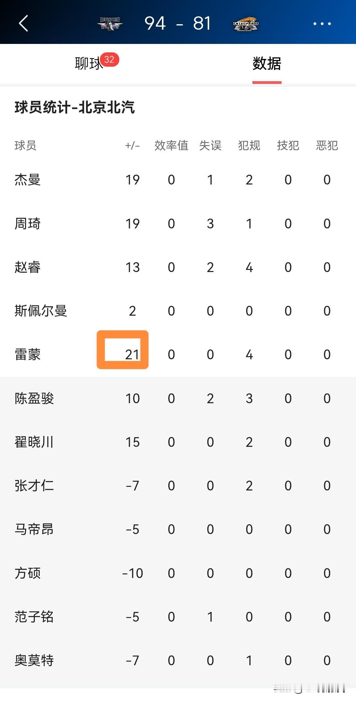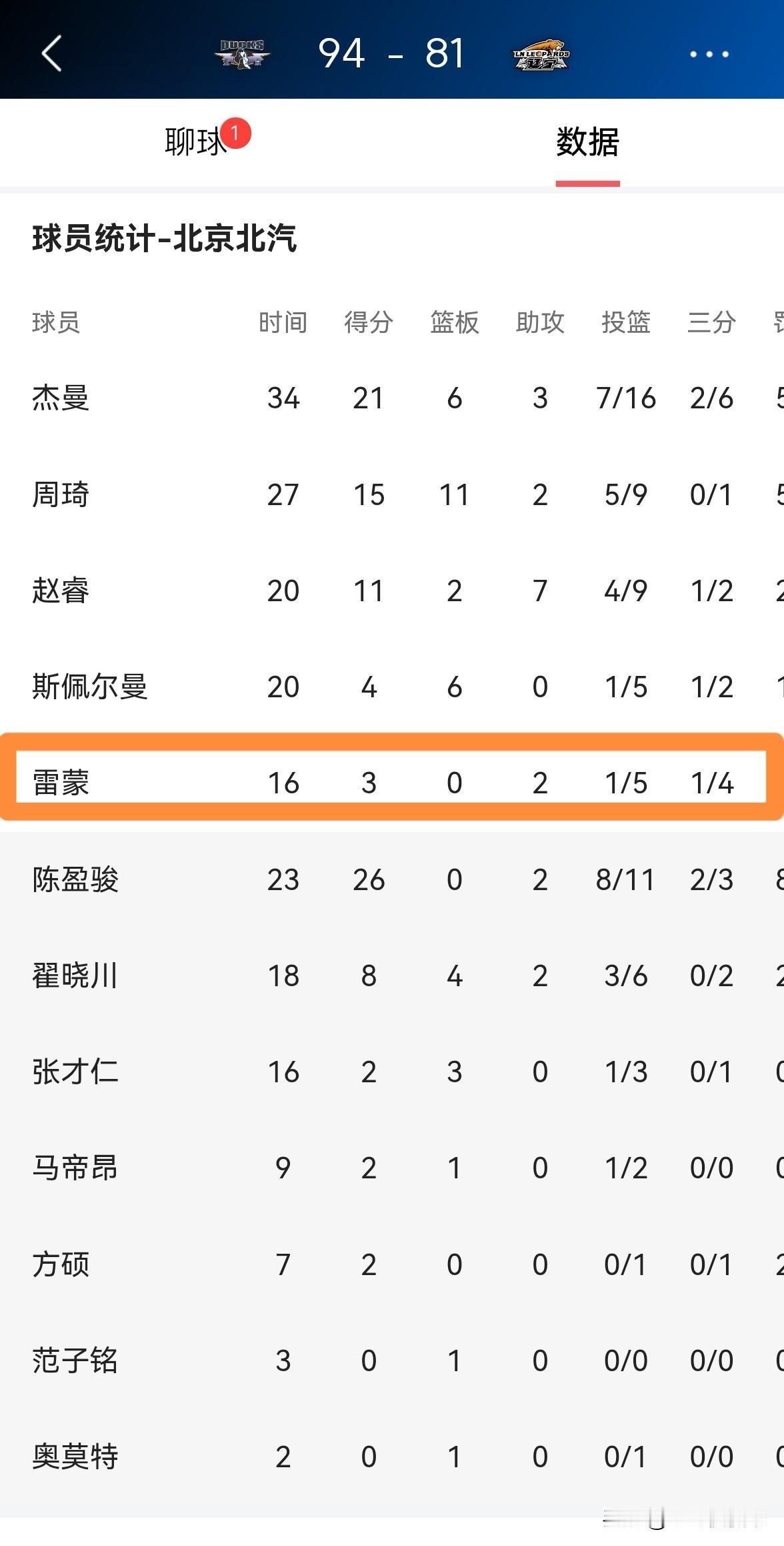 北京北汽大将雷蒙真是太神奇了!在今天北京北汽主场以94:81战胜辽宁本钢的比赛中,雷蒙首发出战16分钟,投篮5中1,其中三分球4中1非常低效的得到3分。虽然雷蒙仅仅得到3分,但是他的场上正负值却是全队最高的+21,大家说雷蒙神奇不神奇?