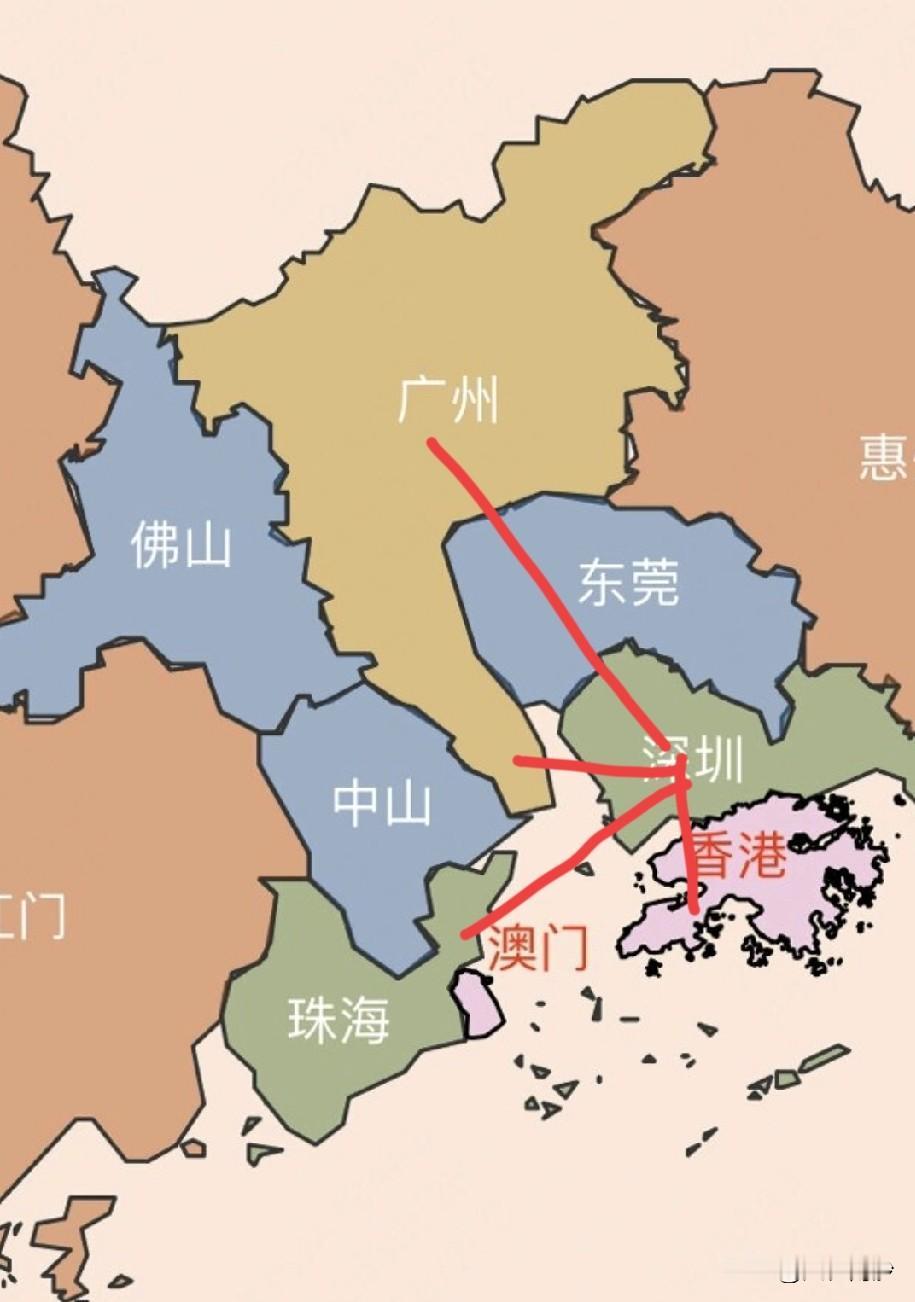 传统看地图的误解,觉得大湾区是这样的正 A 字架构,所以大湾区之芯就南沙。但是其实真实情况的大湾区应该是图二这样子的,所以大湾区之芯一直都是深圳前海