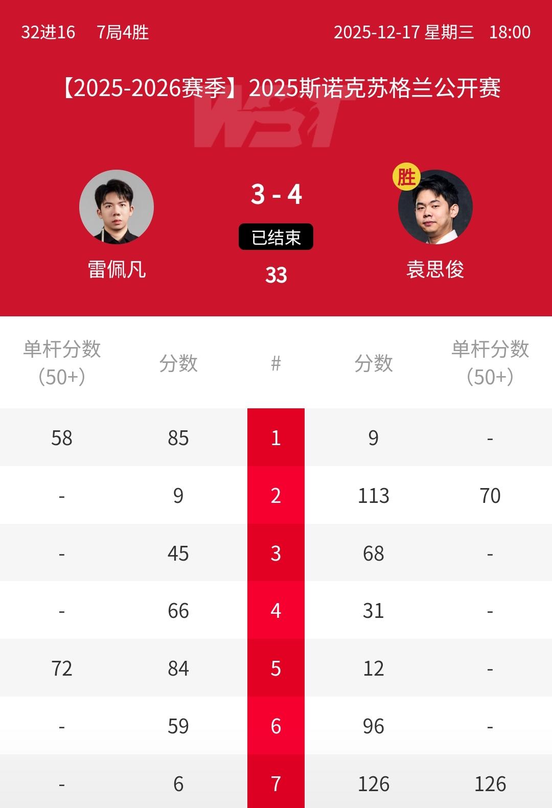 惊天大冷门!4-3绝杀卫冕冠军,中国德比战:袁思俊淘汰卫冕冠军雷佩凡!北京时间12月17日晚,刚刚结束的2025年斯诺克苏格兰公开赛第二轮的一场焦点比赛中,袁思俊上演大逆转,他在0-1开局,2-3被对手拿到赛点的情况下,展现大心脏,他连胜两局,总比分4-3将卫冕冠军雷佩凡淘汰出局。这场比赛第一局,雷佩凡单杆58分开局,85-9取得开门红。第二局,袁思俊扳平比分。随后的比赛中雷佩凡打出2-1攻势,3-2赢得赛点。接下来的,袁思俊展开绝地反击,总比分4-3大逆转晋级!丁俊晖 赵心童