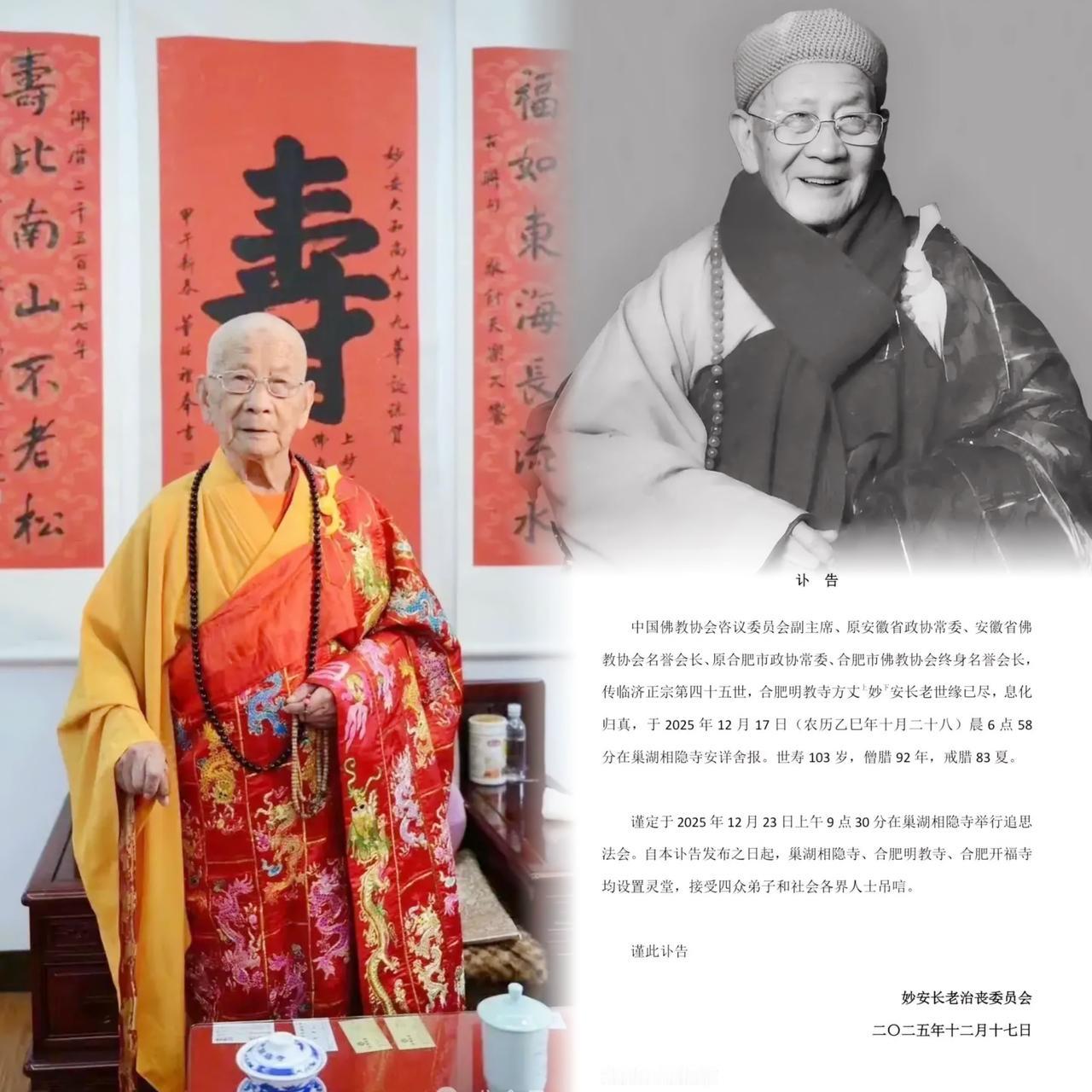 恸哉! 103岁妙安长老于12月17日凌晨在巢湖相隐寺安详示寂,这位跨越世纪的高僧,终究化作了人间的一缕清辉。 92年僧腊、83年戒腊,他不仅是临济正宗传人、明教寺方丈,更以近八旬高龄奔波募化,让拆毁的相隐寺重焕生机,还培养了大批佛教僧才。 所谓高僧,从不是孤高避世,而是把慈悲融进烟火,用一生践行“弘法利生”的初心。 肉身虽寂,但他重修的古寺、传承的善念永远都在,这才是真正的“慧灯不灭”。 你是否去过长老住持的寺院,或是听过他的弘法故事?