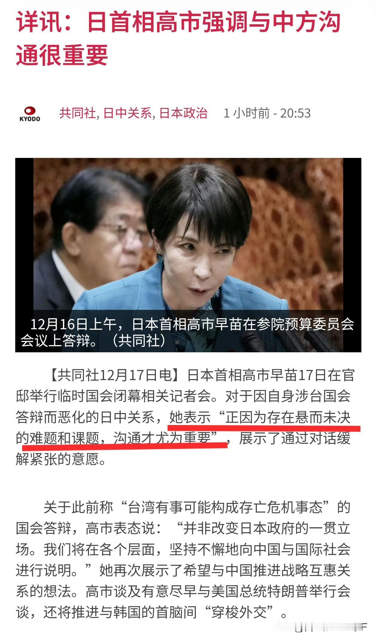中国要当心了,整整40天,高市早苗迎来喘息之机 12月17日下午,2025届日本临时国会正式闭幕 ,高市早苗在首相官邸召开了记者会,由于本次国会闭幕之后,2026年的国会将会在元月份下旬的时候召开,算下来高市早苗将有40天的时间不会被接受国会质询,所以在记者会上,她整个人看上去态度比较放松,被问道中日关系的时候他是这样回答的: 1、她指出中国是日本重要的邻国,日本愿意在各个阶层展开和中方的沟通。 2、她指出,自从她担任日本首相以来,就全面推进中日战略互惠的方针从未改变 3、日本将加强向国际社会阐述,日本政府观点并未改变 4、中国叫停旅游可能会对日本产生影响,日本正在密切关注该事件的发展,在对中方做出回应的同时,日本会加大对旅游业的支持 5、高市希望能够尽快和特朗普以及韩国总统李在明会面。 很明显,高市讲话的基调未变,依旧是坚决不道歉,并且打算继续蒙混过关,同时有一点需要引起我们的重视,没有了国会的约束,高市政府必将会借助一切的机会,在国际场合操作雷达照射事件,对于即将到来的日本和东亚五国的会面,就是高市输出错误观点的一个国际场合。所以对此我们一定要特别关注。谨防高市政府在中方后院点火。