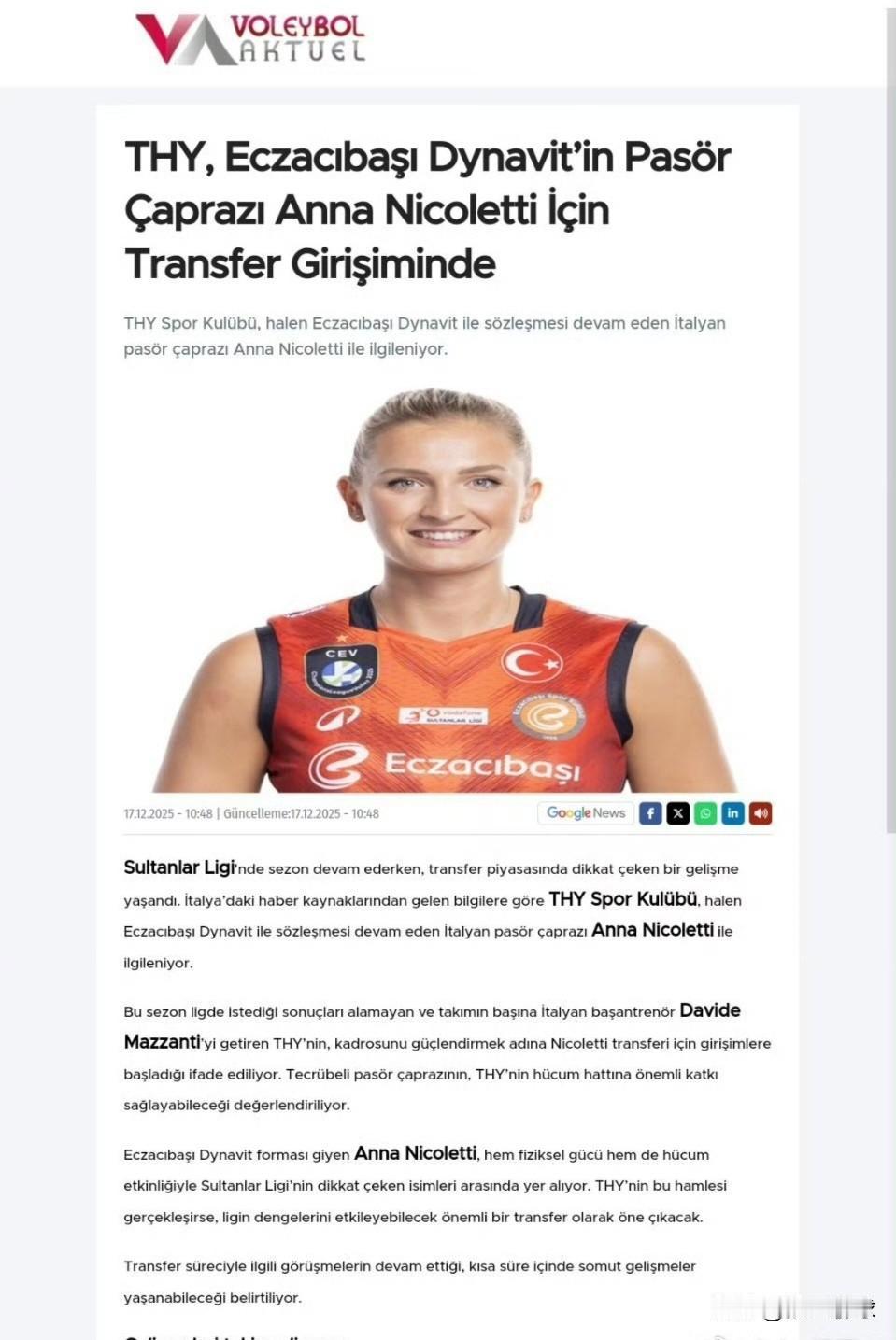 转会传闻一则——土耳其🇹🇷女排联赛赛季进行期间,转会市场出现引人关注的新动态。据意大利🇮🇹消息来源称,土耳其🇹🇷航空俱乐部正对目前仍与伊萨奇巴希俱乐部有合同在身的意大利🇮🇹接应安娜.尼科莱蒂表示兴趣。 有消息指出,本赛季在联赛中未能取得理想成绩、并已聘请意大利🇮🇹籍主帅大卫.马赞蒂执教的土耳其🇹🇷航空俱乐部,为加强阵容已开始就尼科莱蒂转会展开接触。外界评估这位经验丰富的接应可能为土耳其🇹🇷航空俱乐部的进攻线带来重要贡献。 身披伊萨奇巴希俱乐部战袍的安娜.尼科莱蒂,凭借其身体力量和进攻效率,位列土耳其🇹🇷女排联赛中备受关注的球员之一。若土耳其🇹🇷航空俱乐部的此次行动得以实现,这将成为可能影响联赛格局的一笔重要转会。 据悉,相关转会谈判仍在进行中,短期内可能出现实质性进展。我们将持续关注进展。
