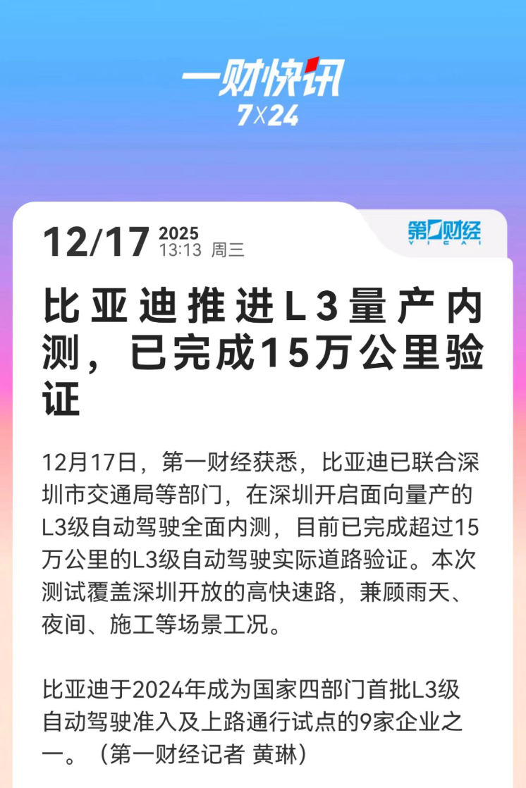 比亚迪联合深圳市交通局等部门,在深圳开启了面向量产的 L3 级自动驾驶全面内测,目前已经完成超过15万公里的实际道路验证。可能有朋友会问,L3 级自动驾驶到底是什么水平?这波内测又意味着什么?L3级不是完全不用管的自动驾驶,而是有条件自动驾驶。简单说,在高速、快速路这类特定场景下,车辆能自己完成加速、减速、变道、跟车等操作,驾驶员不用一直盯着路面,但得保持注意力,遇到复杂情况能随时接管。这和我们现在常用的L2级(比如自适应巡航 + 车道保持)最大的区别是,L2 级需要驾驶员全程监控,而L3级能让驾驶员适当放手,是从辅助驾驶到自动驾驶的关键一步。比亚迪这次内测看得出来很较真,核心原则是安全,测试路线覆盖了深圳开放的高快速路,还特意兼顾了雨天、夜间、道路施工这些复杂场景。要知道,真实路况远比实验室复杂,15 万公里的验证不是随便跑的,而是要反复测试车辆在不同工况下的可靠性,比如雨天能不能准确识别车道线,夜间对向来车强光会不会影响传感器,遇到施工围挡能不能及时避让。这些细节,正是 L3 级能否量产落地的关键。而且比亚迪在这个领域的积累早就有迹可循:2023年拿到了国内第一张L3级自动驾驶测试牌照,2024年又成为国家四部门首批L3级自动驾驶准入及上路通行试点企业之一。能拿到这些资质,本身就说明其技术实力和安全性得到了官方认可。对于我们普通消费者来说,比亚迪推进自动驾驶内测最实在的意义是L3级自动驾驶不再是概念车的噱头,而是真的要走进量产车了。未来开高速、跑快速路,或许我们真的能告别长时间盯路的疲惫,让车辆帮我们分担一部分驾驶压力。