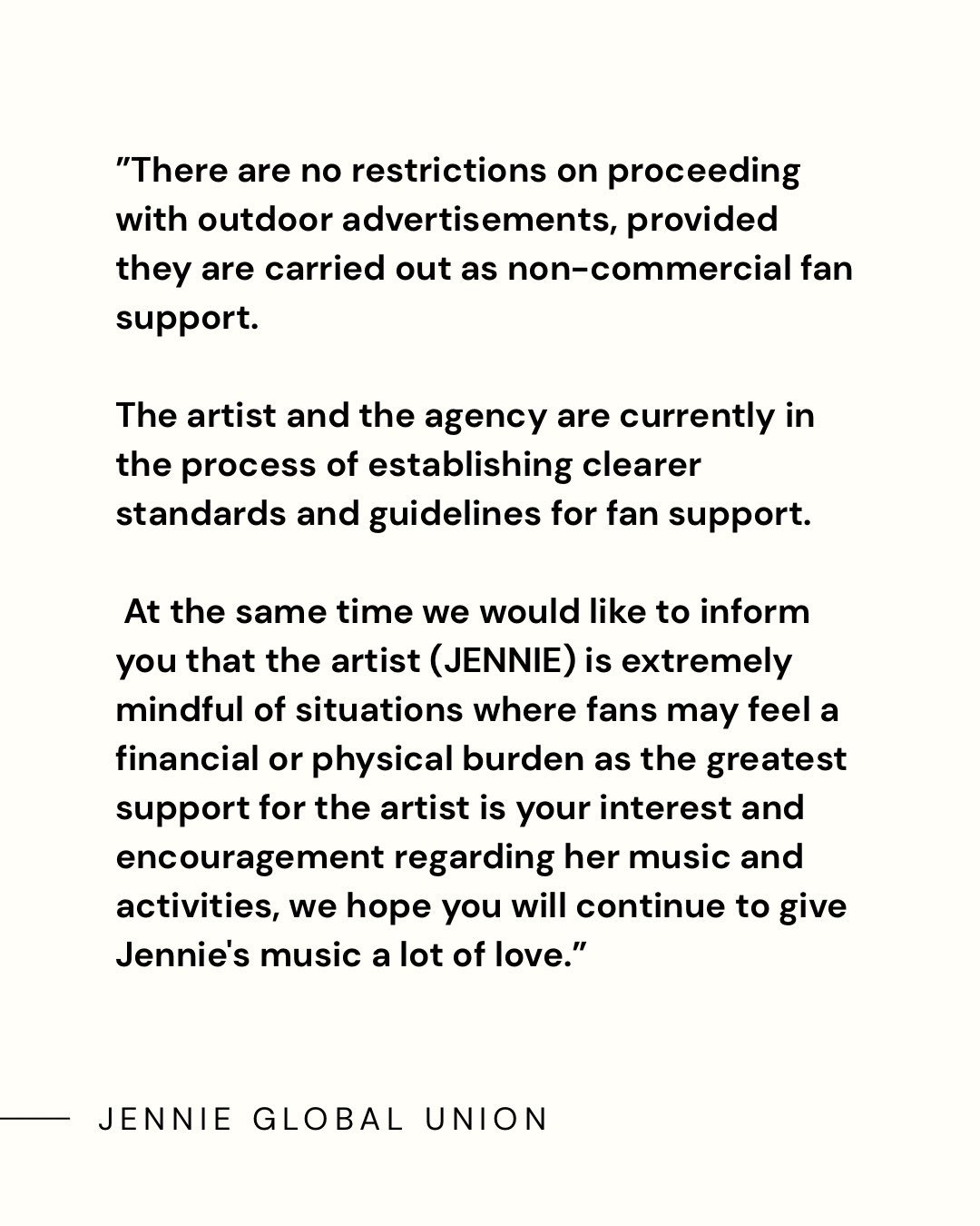 粉丝向OA发邮件询问了有关粉丝支持/项目的指导方针,在回复中OA这样说到:“同时,我们想告知您的是,这位艺人(JENNIE)非常关注粉丝可能面临的财务或实际身体负担的问题。因为对艺人而言,最大的支持源自于您对其音乐和活动的兴趣与鼓励。我们希望您能继续给予JENNIE的音乐以深切的爱意。”🥺🥺🥺