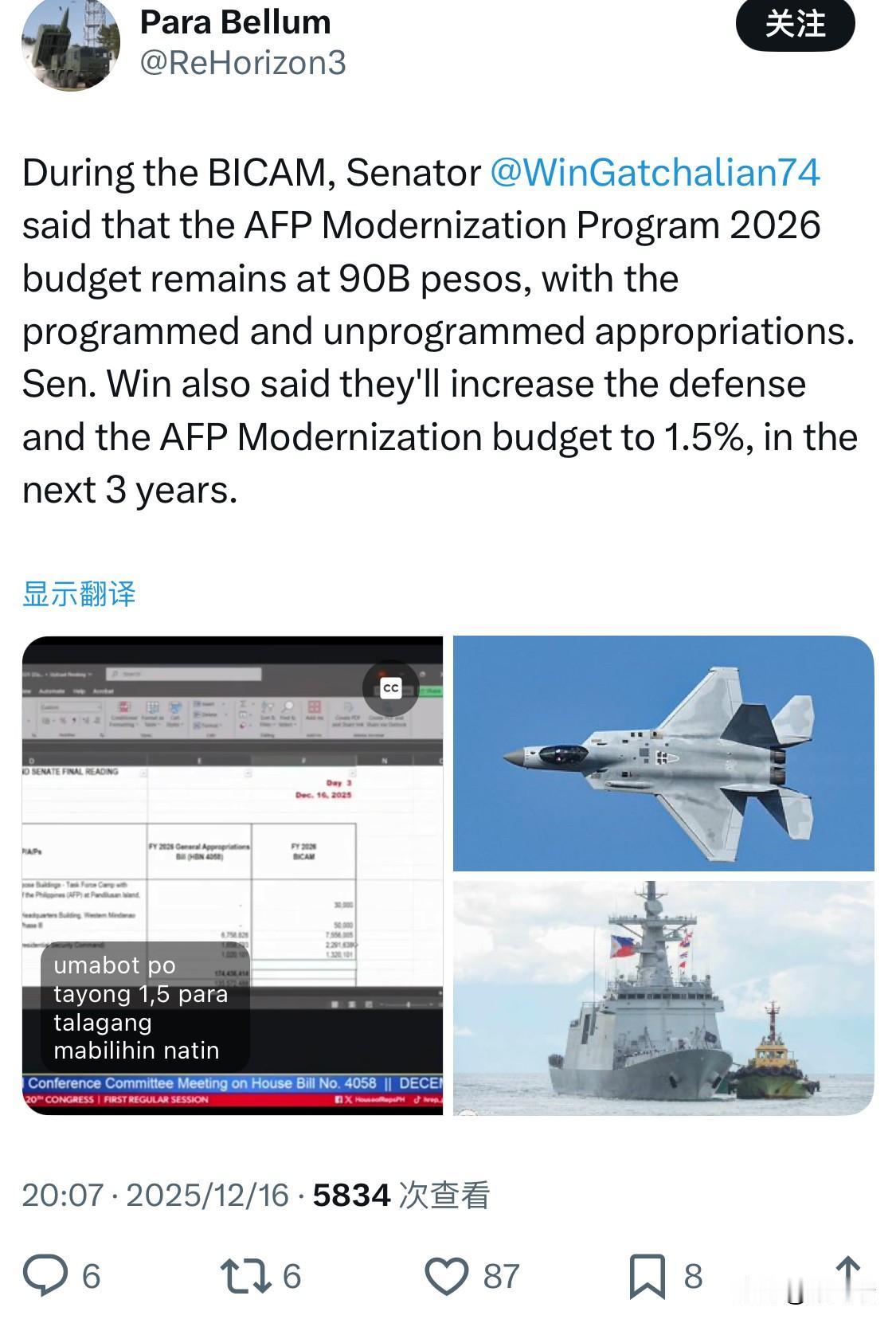 菲律宾武装部队现代化计划 (AFP Modernization Program) 的2026 年预算介绍: 2026 财年的国防预算提案总额为 900 亿比索,其中包括 600 亿比索的已规划拨款(有保障的资金)和 300 亿比索的未规划拨款(用于紧急需求)。 未来目标: 参议员 Gatchalian 表示,他们计划在未来三年内将国防和 AFP 现代化预算增加到菲律宾国内生产总值 (GDP) 的 1.5%。 设备采购: 这些预算旨在支持菲律宾陆军、空军和海军采购新型装备,例如火炮系统、装甲车、防空系统、多用途战斗机和新型护卫舰等。 意向中的韩系军事装备包括KAI KF-21“猎鹰”,这是一款韩国开发的 4.5 代多用途战斗机。 另外,菲律宾海军的 “米格尔·马尔瓦尔”级导弹护卫舰,也是由韩国现代重工 (Hyundai Heavy Industries) 为菲律宾建造的新型舰艇,BRP Miguel Malvar (FFG-06) 是该级别的首舰。
