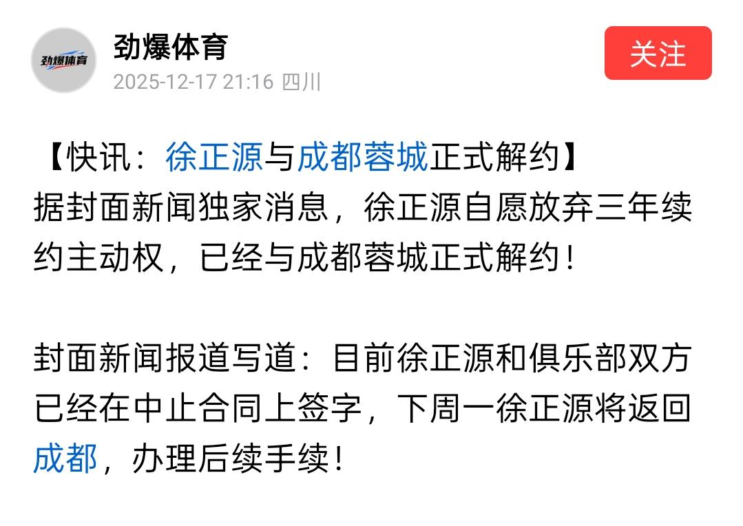 突发!徐正源与成都蓉城正式解约! 北京时间12月17日晚间,据《封面新闻》的消息,成都蓉城主帅徐正源自愿放弃三年续约主动权,已经与成都蓉城正式解约! 据《封面新闻》报道,徐正源和俱乐部双方已经在中止合同上签字,下周一徐正源将返回成都,办理后续手续。 徐正源从2020年12月接收成都蓉城,用了5个赛季,率领成都蓉城冲超,并一步步成为中超强队,本赛季不仅跻身亚冠精英赛,还差一点拿到了中超联赛冠军。应该说徐正源已成为成都蓉城队史上的功勋主帅。双方因为合同分歧,最终走到了分手这一步,让不少球迷感到可惜。 接下来成都蓉城要尽快寻找新帅了,徐正源离任之后,下赛季成都蓉城是否还能继续保持在争冠集团,将存在不小的变数。中超 成都蓉城 徐正源