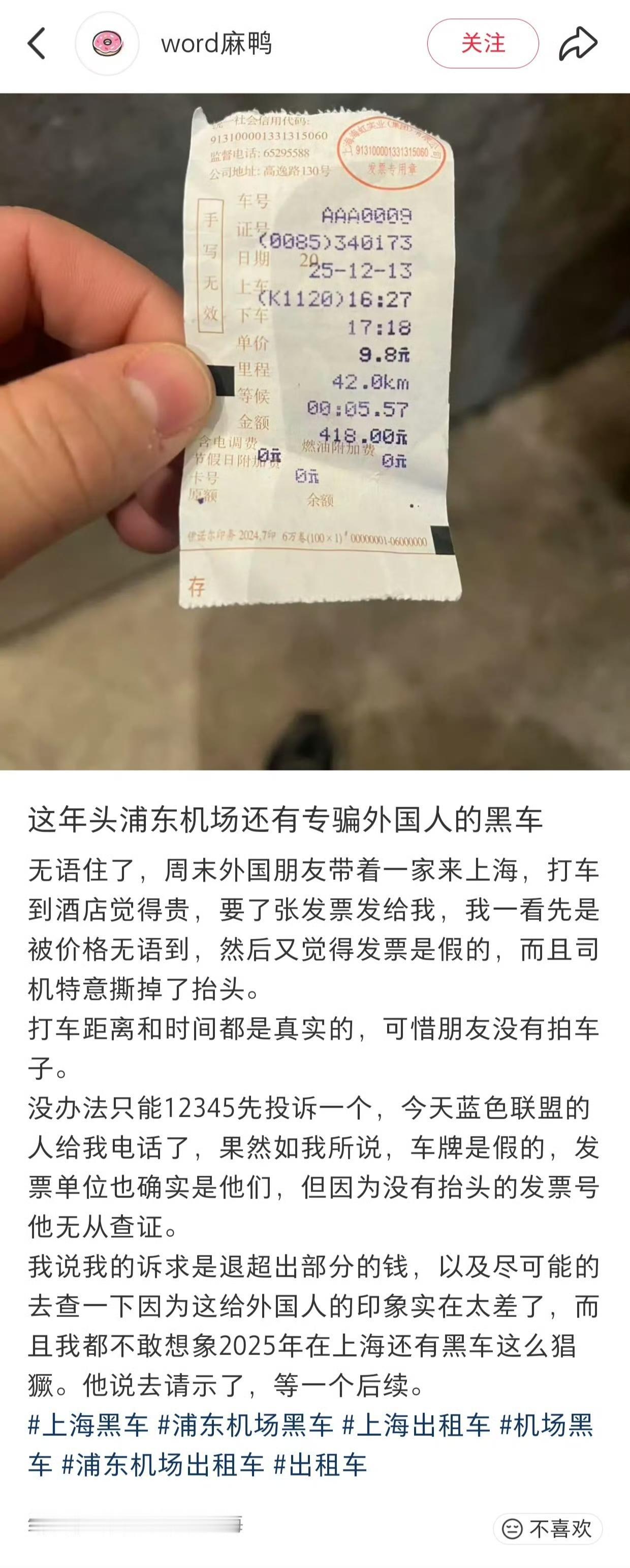 一上海网友吐槽,他的外国朋友浦东机场打车,40多公里花了418块,竟然遭遇了黑车骗局。这些车伪装成出租车,车牌是假的,在晚上兜客,专门针对不懂的外国人。这个网友拿到发票去投诉,发现果然有猫腻,车牌是假冒的,发票没有抬头,压根无法查找车辆。这样的黑车横行,真的很影响上海的国际形象。浦东机场短途票