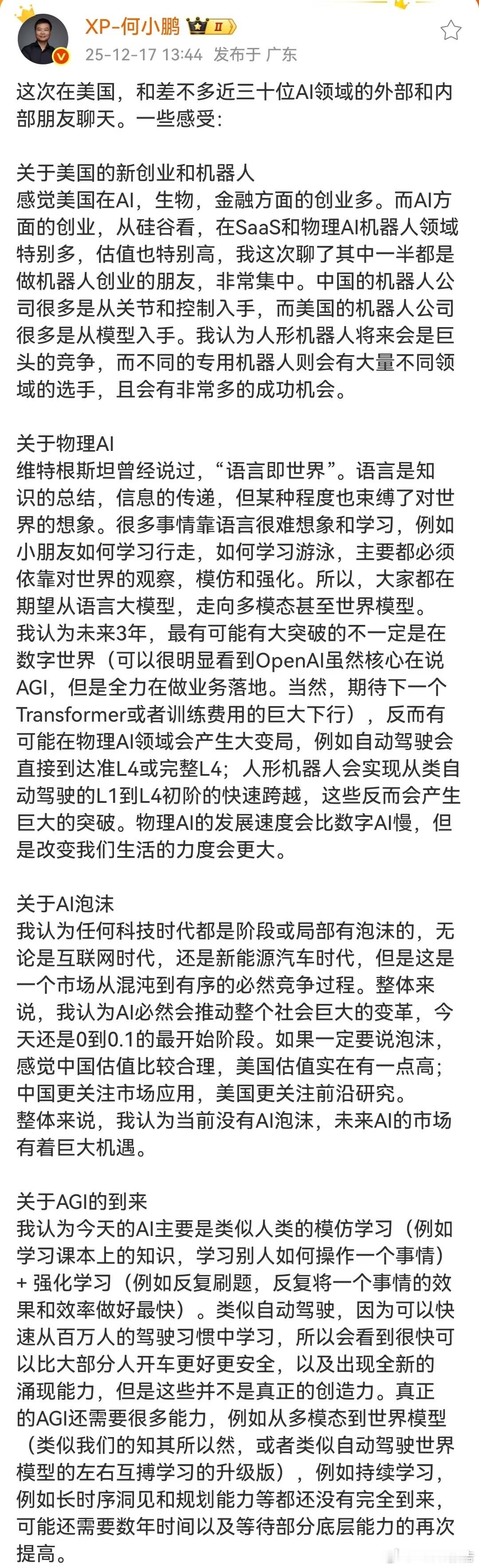 何小鹏发长文谈AI泡沫何小鹏认为当前没有AI泡沫 12月17日,何小鹏发长文谈及AI泡沫,认为科技发展中局部泡沫是市场从混沌到有序的必然。他指出AI尚处0到0.1的起步阶段,必将推动社会巨变,当前无整体泡沫,未来机遇巨大。同时提到中美AI发展差异:中国估值合理、聚焦应用落地,美国估值偏高、侧重前沿研究。其观点贴合行业现状,中国AI应用渗透快、商业化闭环成型,美国则在前沿领域重金布局,这种差异化发展也印证了AI产业仍处理性成长周期。小鹏汽车汽场全开