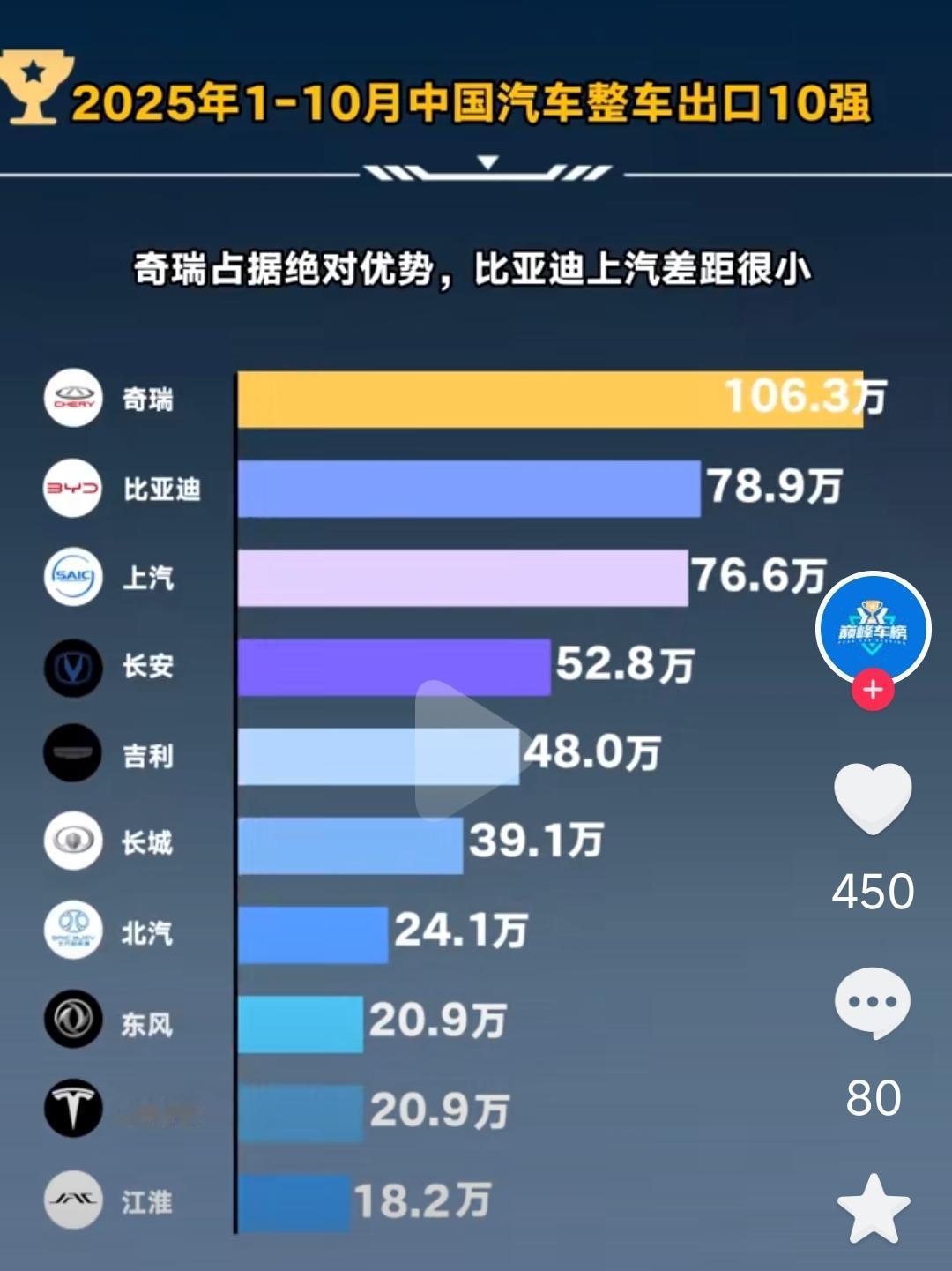 中国汽车业的发展已经超出了人们的想象,人们只看到大街上,马路旁,公路上,到处是汽车,可还有不知道的,我们的汽车已经走出国门,远销海外。 下边有2025年前十个月的销售情况,和11月份的情况。 2025年11月中国车企海外销量头部梯队清晰,奇瑞、比亚迪、上汽领跑,核心数据如下(含同比增幅) : 1. 奇瑞:13.7万辆(+30%),长期稳居出口榜首,主力车型覆盖燃油与新能源 ​ 2. 比亚迪:13.2万辆(+297%),新能源强势发力,增速亮眼 ​ 3. 上汽:9.6万辆(+13.9%),依托海外布局稳定输出 ​ 4. 吉利:5.8万辆(+22%) ​ 5. 长城:5.7万辆(+32.7%) ​ 6. 长安:5.6万辆(+47%)