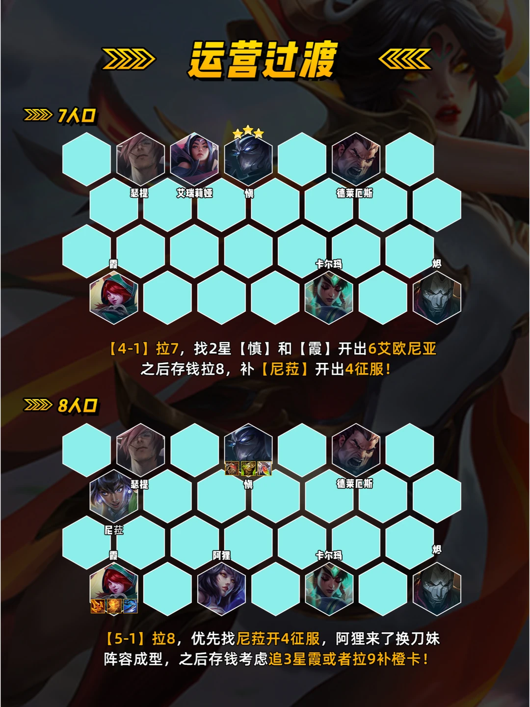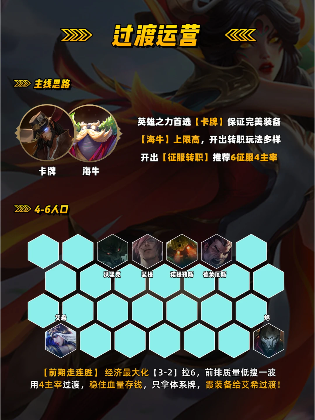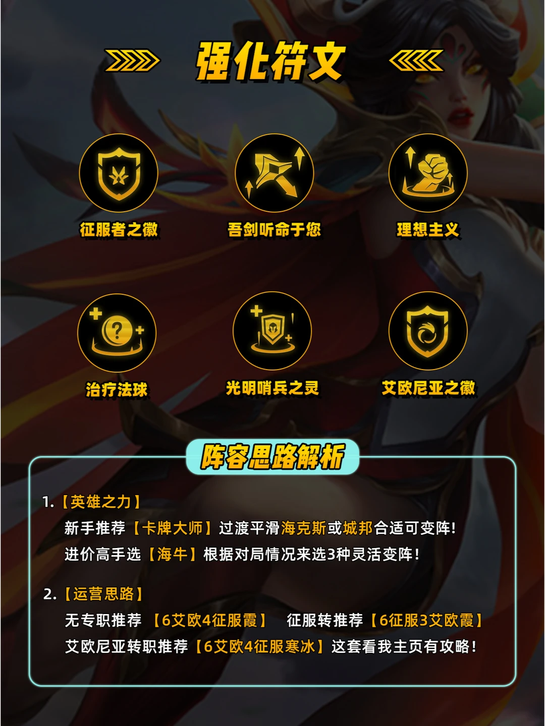 【英雄之力】 新手推荐[卡牌大师] 过渡平滑海克斯或城邦合适可变阵! 进价高手选[海牛]根据对局情况来选3种灵活变阵! 【运营思路】 无专职推荐【6艾欧4征服霞】征服转推荐【6征服3艾欧霞】 艾欧尼亚转职推荐【6艾欧4征服寒冰】看我主页有详细攻略!