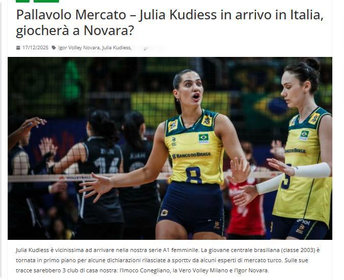 意甲三大豪门争抢巴西天才副攻朱莉娅·库迪斯 [2025 世联赛(VNL)最佳副攻] 意媒:即将来到意大利,她会为诺瓦拉效力吗? 朱莉娅·库迪斯即将进入我们女子 A1 联赛。这位巴西年轻副攻(2003 年出生)因在土耳其运动转会专家的一些声明中提及而重新成为焦点。据称,有三支意大利俱乐部对她有兴趣:科内利亚诺、米兰和诺瓦拉。 最有可能的是皮埃蒙特球队,她与这支中路秋雨那曾达成过协议(正如记者 Attilio Mercalli 在《诺瓦拉信使报》上所报道的),希望本赛季能加盟,但目前已推迟。 库迪斯此前已与她效力多年的巴超米纳斯签署了续约预备合同。在这个奇怪的年末转会市场中,我们将拭目以待,这位出生于巴西利亚的球员是否会在本赛季下半段加盟诺瓦拉,还是只会为 2026-27 赛季效力。 来源:电子排球杂志