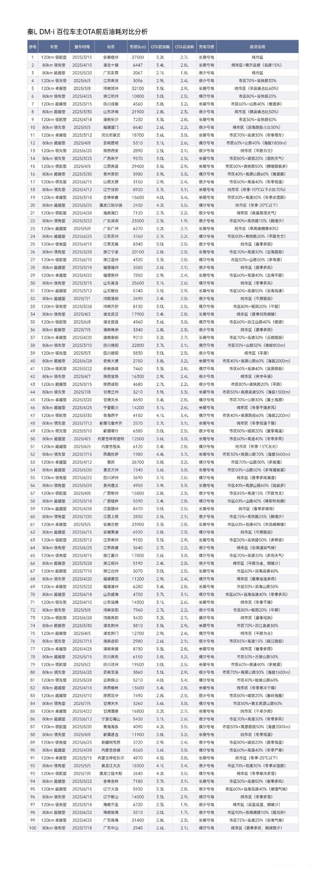 向北统计的一组数据,有心了十月份统计,而且大部分都是北方用户,在统计之前气温相对较高,目前暂不可知空调使用情况,但是统计的结果来看 混动使用的天气条件相对来说要友好一点,也因此这个油耗按统计意义上的16%左右的进化,也的确跟官方说的2.9提升到2.6是有一定的误差同时也要考虑到用电开空调,能耗本身也是传统油车无法比拟的。总之向北这个数据统计很有参考意义,也很值得用混动车、准备买混动车的车主们多看看。另外,比亚迪第五代DM技术之后,多个主机厂也推出类似技术架构,部分迪粉可能对此非议较多,但是看开一点,起码这也证明了这个技术路线的正确性,对不?接下来可能更值得期待的是,跟着这个技术路线的是不是也会在相应时间之后也有类似的OTA,如果真有,那对中国汽车摆脱燃油依赖的意义是不是又进一步提升了?
