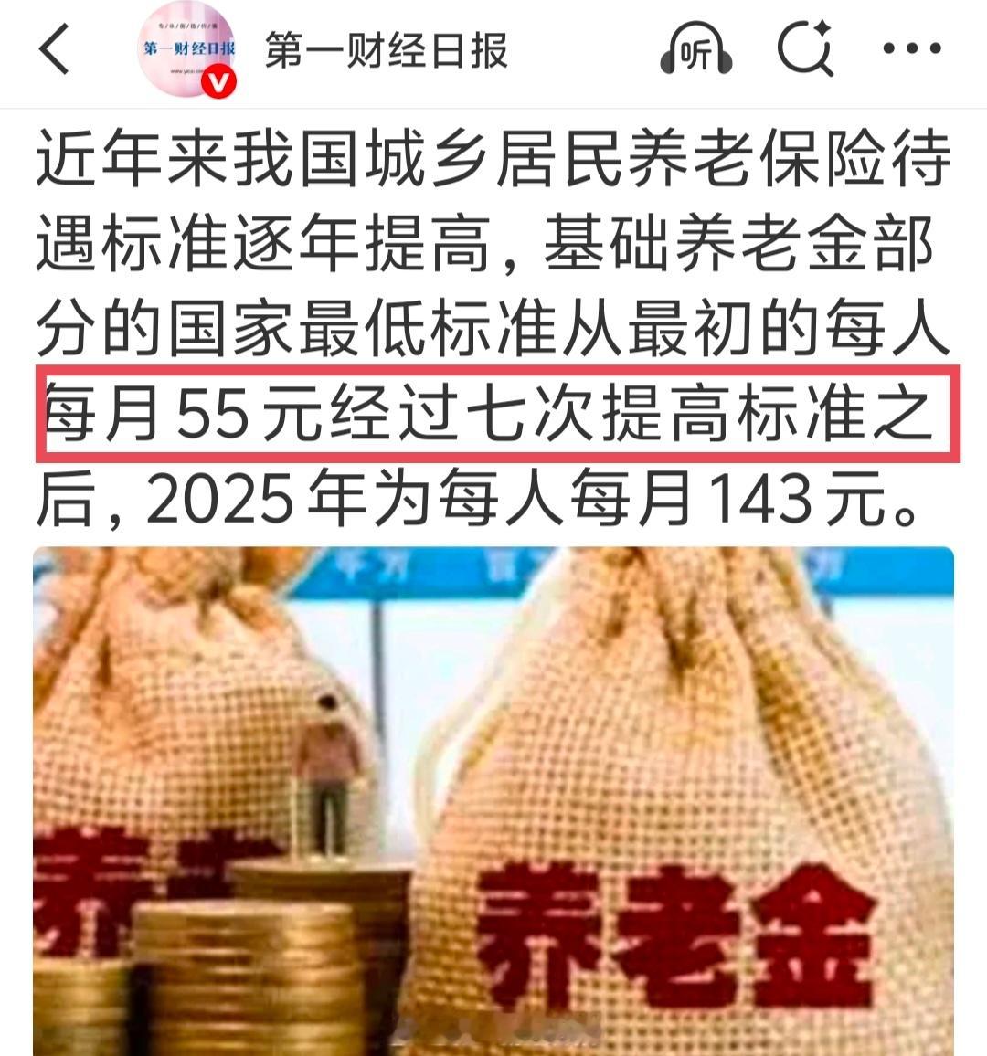 希望这次给老年人多长点吧!看了一下,原来经过了七次提高,从最初的每人每月55元提高到了2025年为每人每月143元!