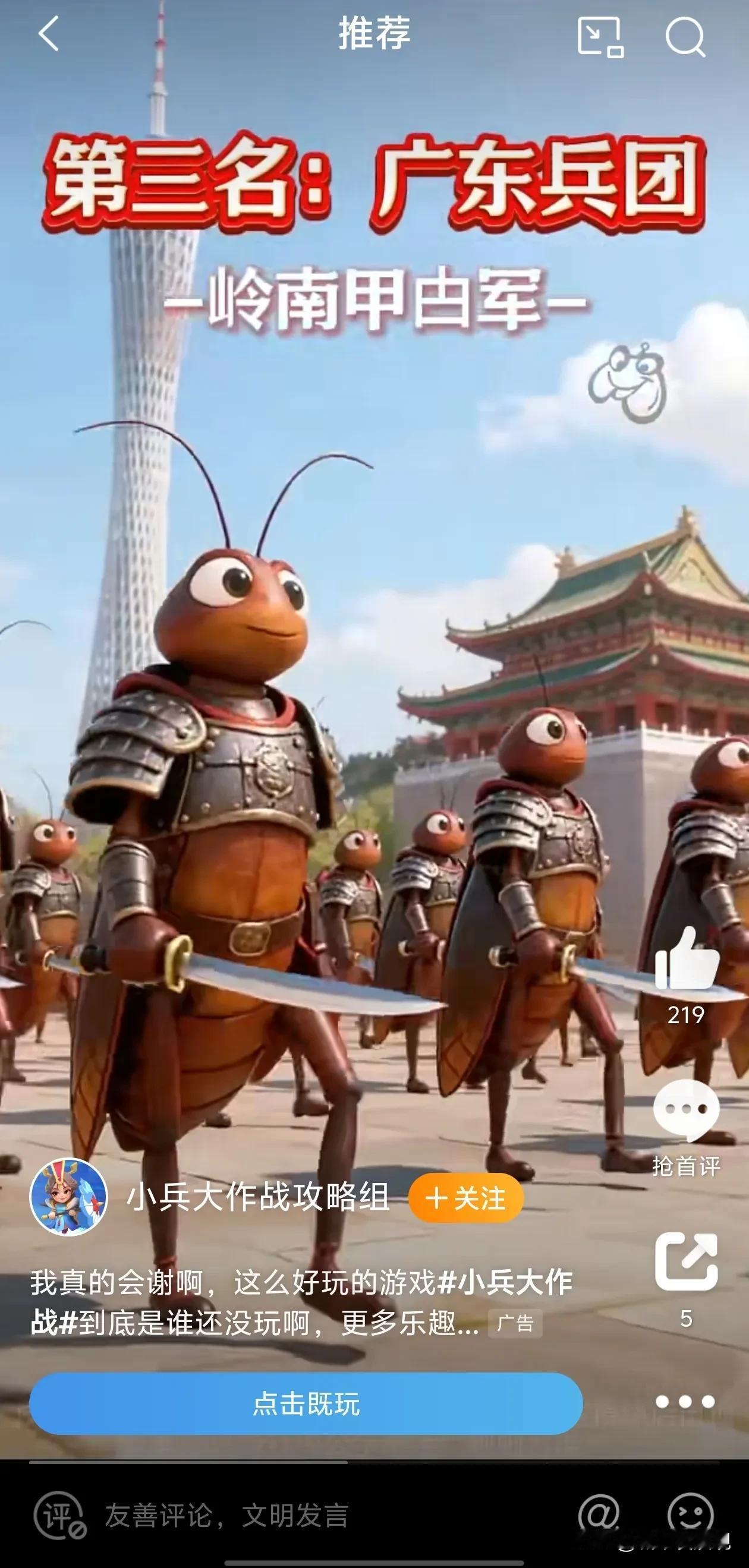 这游戏丑化广东人啊,凭什么在你这款小兵大作战游戏里代表广东兵团形象的甲甴啊?看着形象造型,还把广东省会地标建筑广州塔放在游戏背景后面,背景前面另一个显眼的建筑则是宋徽宗封藩端王于肇庆时的潜邸丽谯楼(现存建筑为上世纪五十年代重建)。很难让人不相信这是游戏公司策划故意搞事情。 广东这么多特色代表动物,寓意更好的华南虎、中华白海豚、白鹇、韩江鼋等珍稀动物完全可以用做广东形象动物!