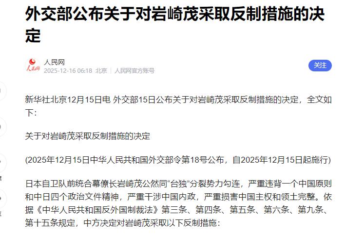 杀鸡儆猴! 中国终于要出手了! 12月15日,中国外交部宣布对日本岩崎茂采取反制措施,冻结其在华财产,禁止交易合作,永久拒签不准入境。 在日本军界,他可是实打实的“大人物”:从防卫大学毕业後,从战斗机飞行员一路升到自卫队统合幕僚长,这职位相当于日本的总参谋长,25万自卫队曾全在他的指挥下。 退休后接着当防卫大臣的政策顾问,2023年还拿了日本最高荣誉“瑞宝大绶章”,军界政界的关系网密得像蜘蛛网。 这么一个手上握过军权、背后有人脉的角色,今年3月居然堂而皇之接了台当局的活儿,成了所谓的“政务顾问”。 岩崎茂刚上任没几个月,就跑到日本杂志上放话,说“中国周边紧张感加剧”,话里话外都在炫耀,自己就是来给台湾输送日本军事经验的。 往前翻他的黑历史更气人,2021年他就写文章逼着岸田政府,把涉台内容塞进《国家安全保障战略》,还鼓噪“台湾有事就是日本有事”这种歪理。 说白了,他哪是“个人行为”?分明是拿着日本军界的资源当筹码,给“台独”搭梯子,把台日军事勾连摆到了台面上。 岩崎茂这步棋,其实是“台独”和日本右翼的共同算计。现在“台独”分子一边抱美国大腿,一边急着拉日本当靠山,岩崎茂就是他们打通台日军事联系的“关键中介”。 咱们这次出手,精准就精准在打蛇打七寸。 岩崎茂退休后在全日空、三菱重工好几家日本大企业当顾问,这些企业在咱们中国市场的盘子大得很。 现在咱们一制裁,他在这些企业的收益全被冻结,关联企业的股价直接跌回一年前,合作方吓得赶紧终止合作。 这一下就让日本企业看清楚了:是要赚中国市场的钱,还是要跟着搞分裂?答案再明白不过。 之前美国有政客窜访台湾,咱们一制裁,他关联的企业在华半年就亏了上亿元,后来美国政客再敢跳出来的就少多了。这次岩崎茂级别更高,反制更严,效果只会更强。 日本内阁官房长官现在跳出来说“遗憾”,可当初咱们交涉的时候,他们还说这是“个人行为”撇得干干净净,现在装样子根本站不住脚。 尤其让人不能忍的是,今年是抗战胜利80周年,也是台湾光复80周年。 日本当年殖民台湾50年,在台湾问题上欠着咱们血债,本该谨言慎行,却纵容军事高层勾连“台独”,这简直是往咱们伤口上撒盐。 要知道,台湾是中国领土,早被“七重锁定”:《开罗宣言》《波茨坦公告》明确它必须归还中国,中日联合声明里也写得明明白白。 咱们这次制裁,依据的是《反外国制裁法》,条款清清楚楚,有理有据,光明正大。 这记“杀鸡儆猴”的重拳,敲给岩崎茂听,更敲给所有外部势力听。岩崎茂的下场证明,不管你在国外多风光,只要敢碰台湾问题这条红线,中国就有办法让你付出惨痛代价。 台湾是中国的内政,别说是一个日本前军官,就算是更大的势力,也别想插手。那些还想给“台独”当靠山的人,该醒醒了。