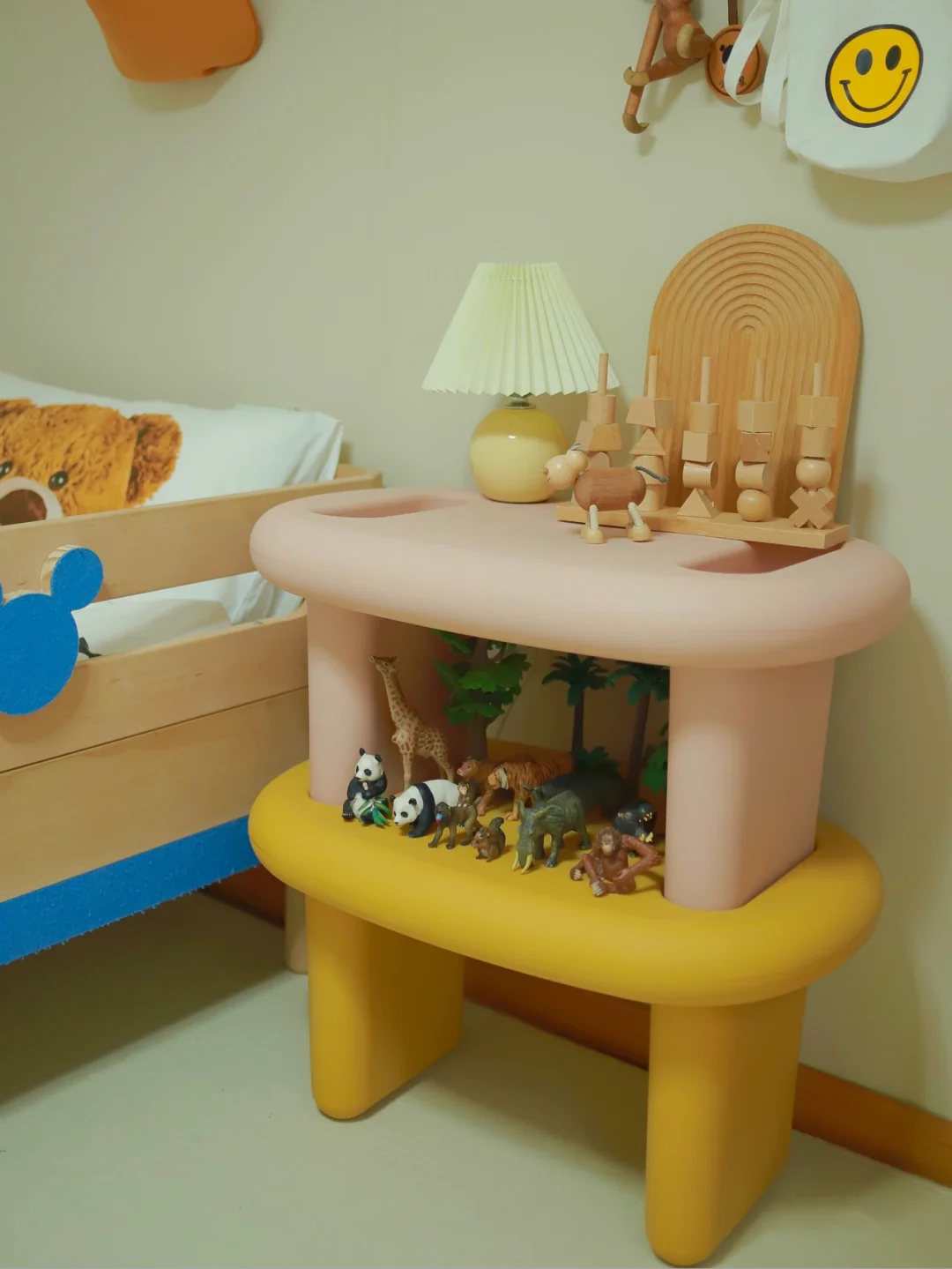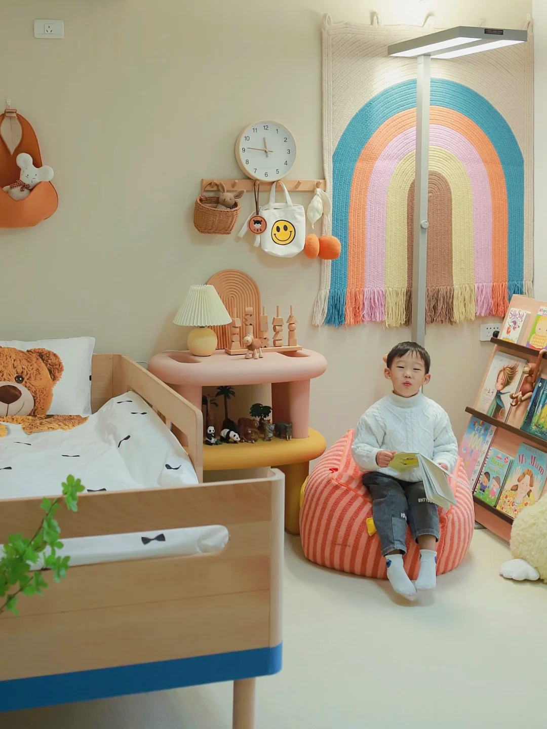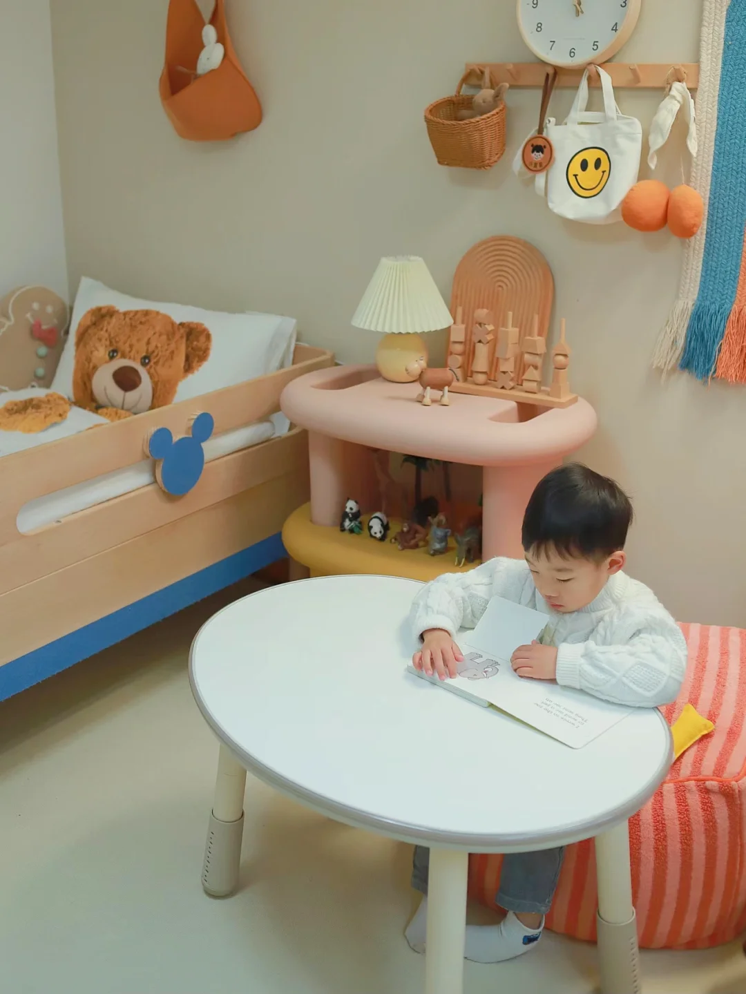 房间不大,所以暂时学习跟玩耍都是在花生桌上的。新入了一个叠叠桌,两个可以叠在一起就是一个床头柜➕置物架,拿下来单独的也可以当小桌子用。地上是铺的地毯,有时候玩玩具也可以直接在地上,云朵靠枕可以当枕头也可以靠着看看书,颜值🉑