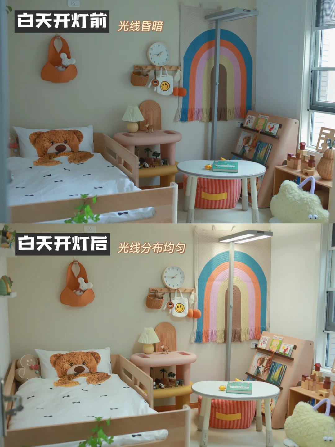 因为我们儿童房是朝北的,所以基本没有阳光房间光线不太好,学习的话,即便是白天都需要开灯。担心娃儿的视力会受影响,想买个护眼灯,但台灯照射范围又太小了。看个这个立式护眼灯的时候,眼前一亮💡不仅桌面亮了,整个学习区都覆盖了。模拟的太阳光也太舒服了,显色指数特别高,孩子看绘本和画画的时候,明显可以看到颜色很真实。虽然真的不便宜,但感觉还是很值得👍