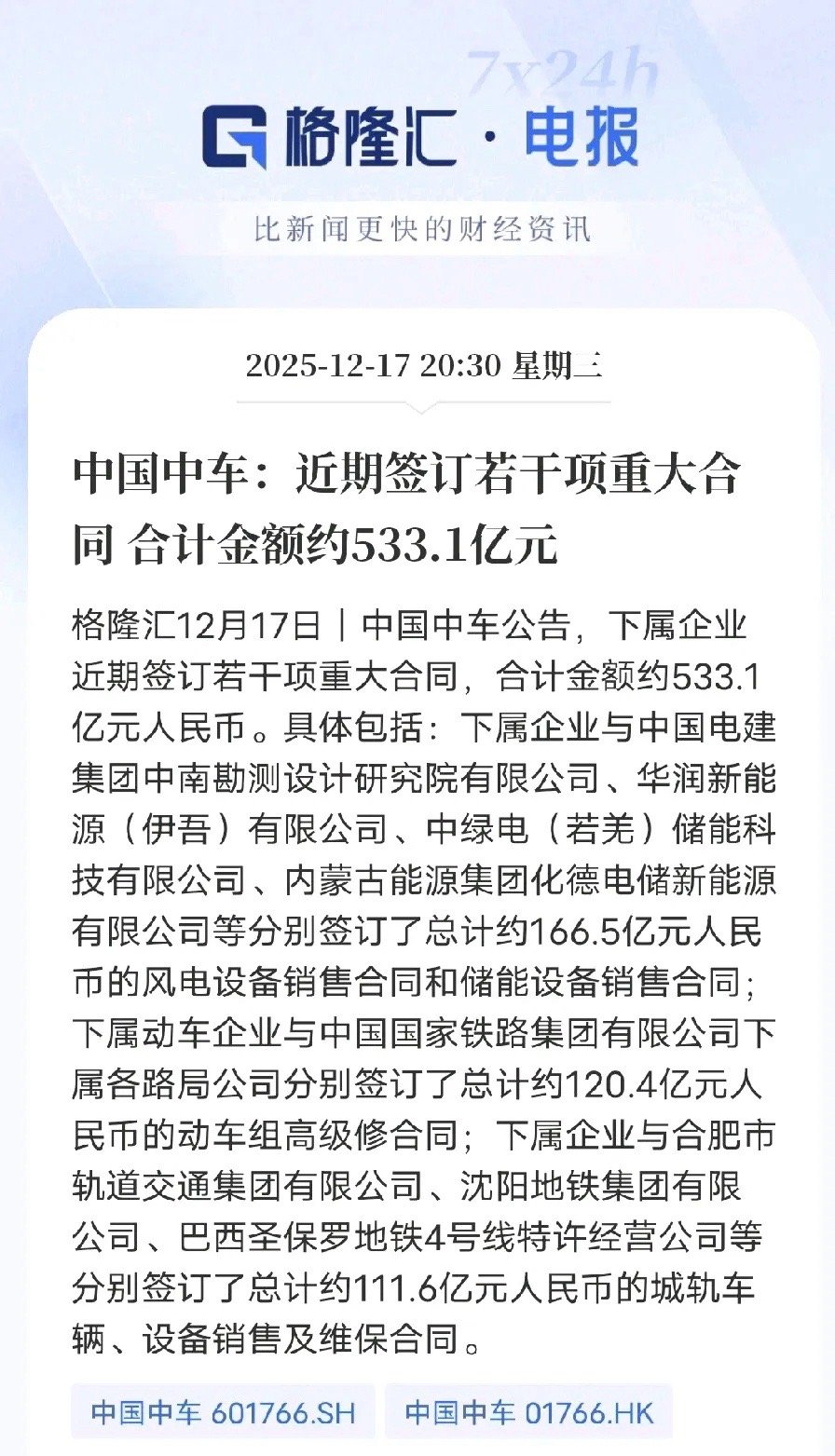 533亿大单!中车的“双线突破”中国中车533.1亿元重大合同落地,坐稳南北车合并以来第三大订单宝座!这笔订单不只是数字亮眼,更藏着转型深意:166.5亿新能源订单印证“轨交+风光储”跨界成功,111.6亿海内外城轨合同(含巴西圣保罗项目)彰显全球竞争力。从国内动车组高级修到海外全链条服务,中车早已跳出单纯装备制造,以“系统+服务”模式兑现国际一流企业目标,新质生产力正在加速落地!