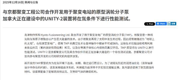 日企自称这一技术领先中美,中国花15年都造不出来,日网民沸腾:小心中国人来偷 近日,日本京都融合公司接受记者探访时,首席运营官世古圭对着镜头抛出了一番惊人言论:“这个装置中国人拼命造了15年都没造出来,美国也想造类似产品,但也没造出来。” 他口中的装置,正是该公司参与研发的核聚变相关设备,眼下他们正推进名为FAST的聚变发电演示项目,还拉上了东京大学等高校和日立、京瓷等企业组成联盟。 在京都融合的实验室里,相关装置的蓝色环状结构格外显眼,世古圭介绍时特意强调,他们的技术基于成熟的JT-60SA技术,还开发了独特的集成测试设施。 这番吹嘘很快传到日本网络,X平台上相关讨论迅速升温,不少网民跟风叫好,有人说“终于在高端技术上压过中国了”,更有极端声音喊着“技术要盯紧,别被中国人偷偷学走”,类似言论在短时间内获得不少点赞。 但实际情况并非世古圭说的那样,就在不久前,成都瀚海聚能公司刚完成了中国首台商业化直线型聚变装置的建设,工作人员按下启动键,装置里的等离子体顺利点亮。 这个从立项到点亮只用了约一年的装置,核心技术全是国内团队自主研发,和京都融合的技术路线不同,却同样瞄准了商业发电目标。 中国在核聚变领域的投入一直很扎实,中科院下属的等离子体所正在推进多个关键系统的建设,这些系统能解决聚变燃料循环的核心问题。 而且中国的“东方超环”装置早已实现过亿度等离子体运行,相关技术还出口到了欧美国家,京都融合口中“中国15年造不出”的说法,显然忽略了这些事实。 核聚变技术本就是全球共同攻关的难题,京都融合的FAST项目要到2030年代才计划实现发电演示,而中国企业也定下了2028年实现首次核聚变发电的目标。 技术竞争靠的是脚踏实地的研发,而非夸大其词的吹嘘,日本网民那些“防偷技术”的焦虑,说到底还是对自身技术实力的不自信。 以上都是个人观点,对此您有什么不同的看法,可以在评论区留言讨论!!!
