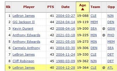 据统计,历史上在20岁之前单场贡献40+的除弗拉格外也只有以下球员:詹姆斯,3次爱德华兹,2次杜兰特,1次安东尼,1次克利福·罗宾逊,1次GG·杰克逊,1次