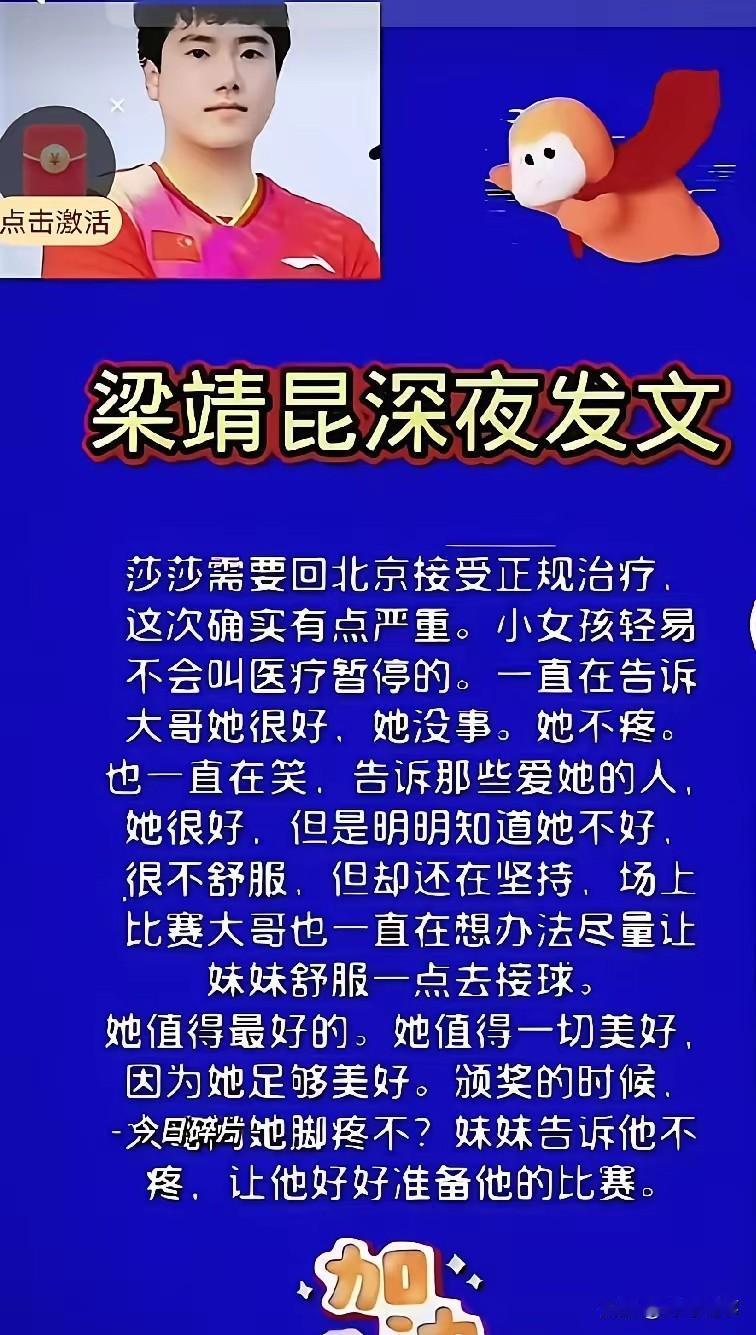看到孙颖莎在香港总决赛脚踝扭伤退赛的消息,真是心疼啊。这姑娘第三局就明显不适了,第四局绑着固定绷带还硬扛,最终撑不住退赛,晚上却仍坚持打完混双。镜头扫到她肿起的脚踝,谁能不揪心? 王楚钦赛后坦言“到了极限”,一天三赛的强度连前世界冠军朱雨玲都喊累。WTT密集赛程下,运动员真像赶场一样。 最触动我的,是韩国选手申裕斌混双夺冠后那句“颖莎欧尼保重”,以及王励勤第一时间冲上去陪莎莎就医的画面。这种超越胜负的关怀,比金牌更珍贵。 某些粉丝却把矛头指向乒协甚至队友蒯曼,实在不该。运动员需要的是理性支持,而不是过度解读。希望莎莎好好养伤,健康才是最长久的赛场竞争力。