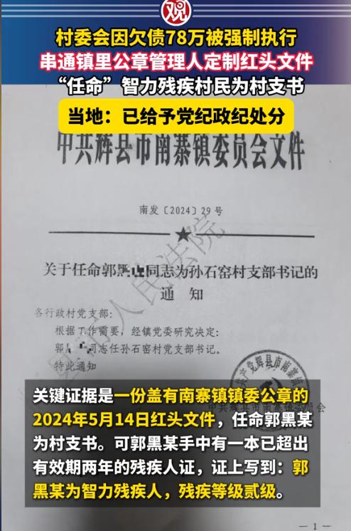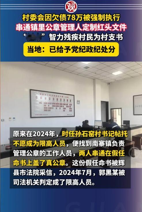 河南新乡,男子为建设村子陆续垫付了78万元,然而村委一直没还钱。男子起诉村委还钱,虽然案子是赢了,但在申请执行时,男子却发现村支书竟然变成了自己的堂弟,而堂弟是智力残障人士,还是五保户,这根本不可能做村支书。男子气坏了,这分明就是要赖账,还欺负残疾人。(来源:观察者网) 郭先生本来是个生意人,赚了一些钱后在村里当起了村委主任。那是2002年的时候,村子里很穷,村委也没什么钱。为了建设村子,郭先生只能自掏腰包。 在郭先生担任村委主任的15年里,他陆续拿出了78万元建设村子,让不少村民的腰包都鼓了起来。但在2017年,郭先生被查出有违规违纪行为,所以被免职了。 郭先生被免职后,自然是要把这么多年垫付的钱给要回来,但是村委却说没钱。无奈之下,郭先生就把村委告上了法院,新任村支书帖某作为被告出庭。 本来郭先生认为这起案件十分简单,可没想到这一打就是2年多,历经了一审胜诉、二审败诉、再审胜诉后,法院最终判决村委应当返还郭先生78万元本金。 可是村委并未在规定时间内还钱,只是说村里没钱。郭先生只得申请强制执行,最终在村委的银行账户中执行到了5.8万元。 执行法院调查发现,村委的确没有财产可以执行,于是对村委主任郭某发出了限高令。 郭先生在得知村委主任被限高后,去查看了下记录,但发现被限高的不是帖某,而是自己的同族堂弟,堂弟什么时候变村委主任了? 郭先生对堂弟的情况十分了解,堂弟是智力残疾二级,而且还是个五保户,这种情况怎么可能当村委主任? 经过一番细想,郭先生这才明白,原来法院要对村委强制执行,如果村委没钱还,将会被限高,村支书将会被列为被执行人。 郭先生气坏了,没想到帖某连智力残障人士都欺负,于是他对此事进行了举报。 后经调查,帖某刚担任村支书不久,就遇到了郭先生的这起案件。他认为自己无力还钱,所以就串通了相关人员在2024年5月14日伪造了一份任命通知,这才有了郭先生的堂弟变成村委主任的情况。 目前,帖某以及公章管理人员、镇长均受到了相应的处分。 根据《村民委员会组织法》第11条规定,村民委员会主任、副主任和委员,由村民直接选举产生。任何组织或者个人不得指定、委派或者撤换村民委员会成员。 由此可见,村委主任那必须是由村民选举产生的,而不是谁来任命的。 更何况村委主任的选举,那必须是具有完全民事行为能力之人,而郭先生的堂弟是智力残障人士,明显不符合。 这也能看出,帖某为了摆脱债务,手段是有多恶劣,这样没有担当的人不配成为村委干部。 其次,帖某为了逃避债务,伪造了一份红头文件,将村委主任的名头给了郭先生的堂弟,这其实已经涉嫌犯罪。 《刑法》第280条规定,伪造国家机关的公文、证件、印章的,处3年以下有期徒刑、拘役、管制或者剥夺政治权利,并处罚金;情节严重的,处3年以上10年以下有期徒刑,并处罚金。 虽然帖某已经受到了相应的处分,但关于犯罪的问题,还需要警方这边来处理,所以目前只有帖某被处分的记录。 至于帖某最终会不会被判刑,还要通过犯罪情节、是否有自首等可以减轻处罚的情节等综合判断。 最后,虽然村委没钱不是帖某的错,欠债也不是帖某的错,他也只是刚刚上任。但作为一名村委主任,他必须要有担当,而不是用这种违法手段来逃避。 对此,您怎么看?欢迎留言交流。