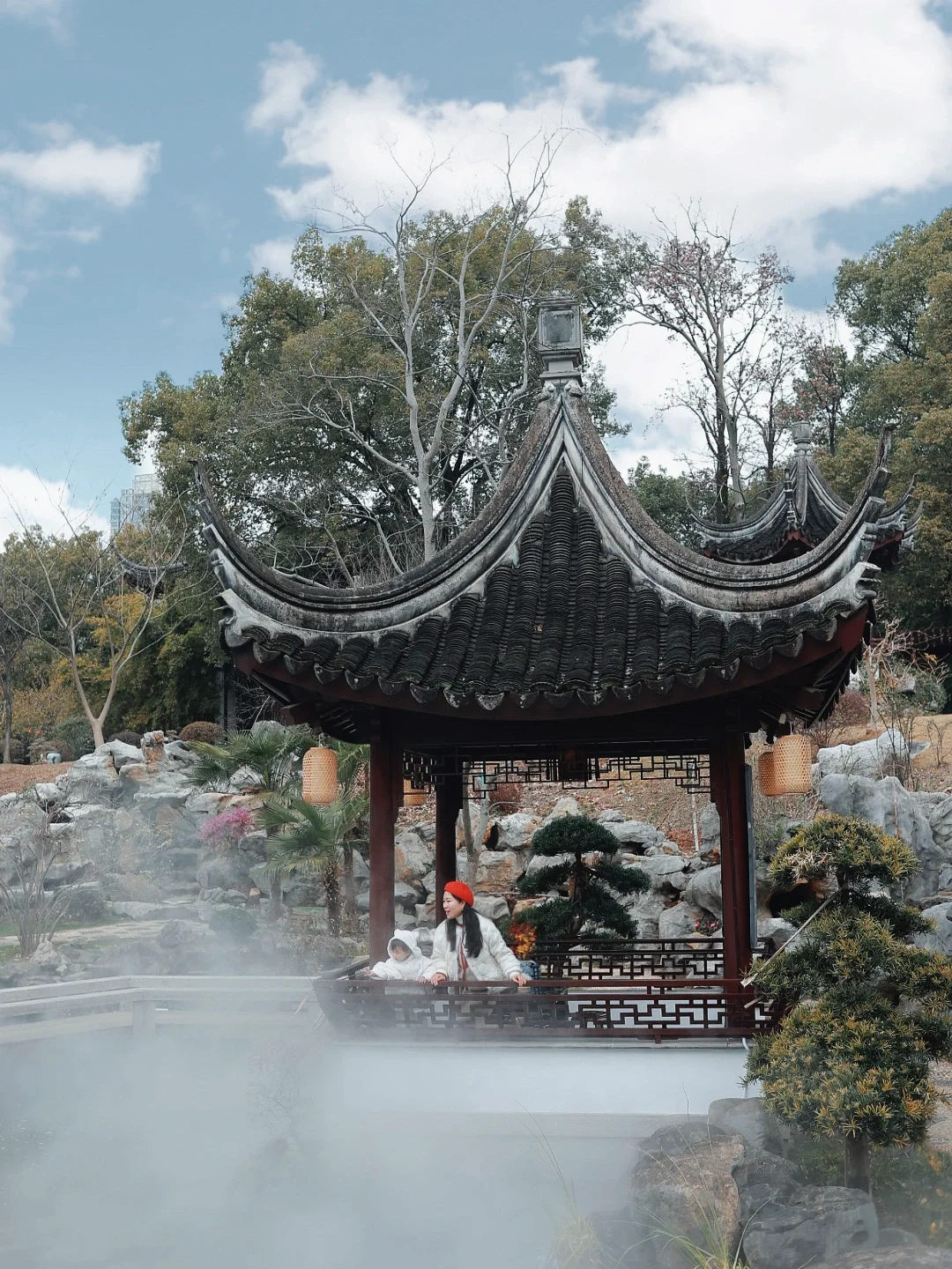 2️⃣面对亭子左边有一片假山,爬到假上俯拍,人站在桥上;也可以拍人的背影