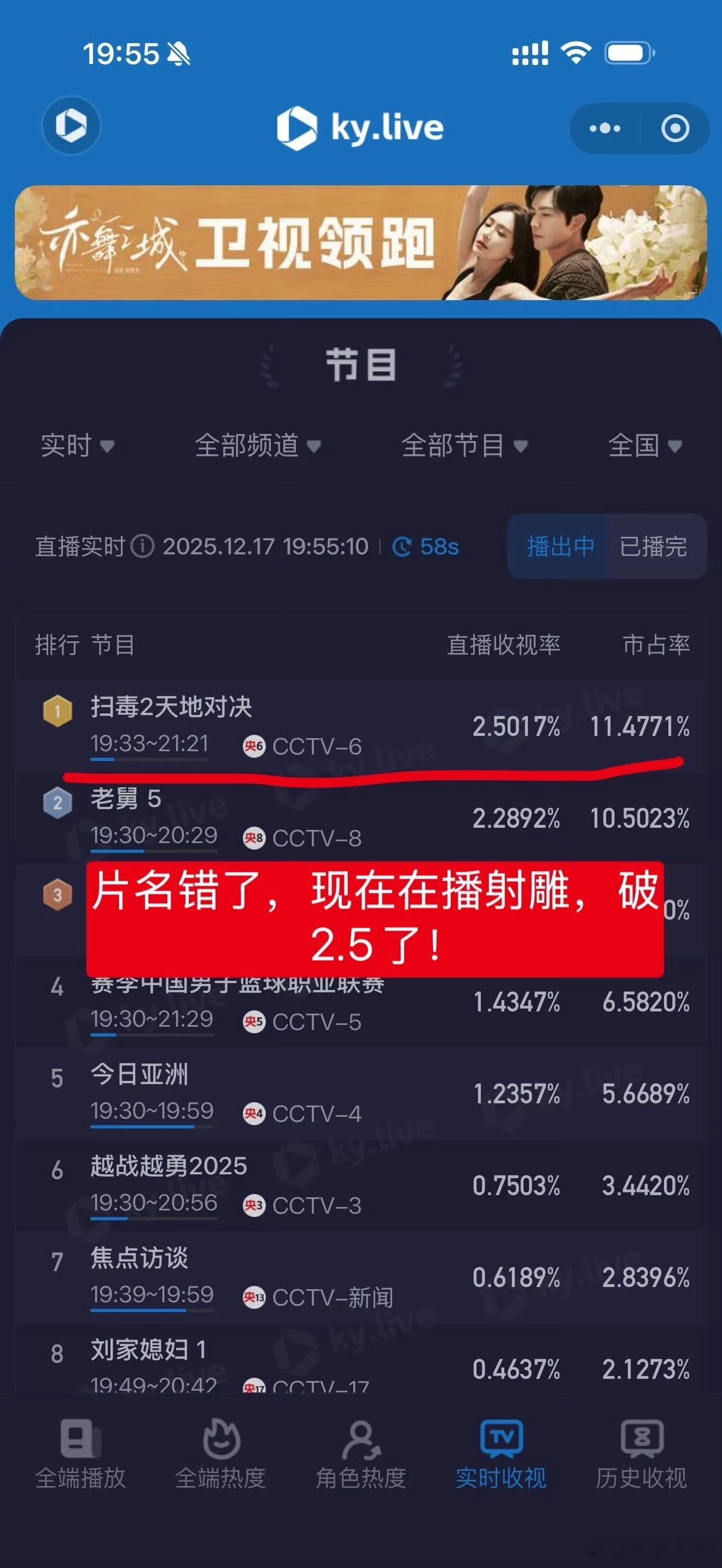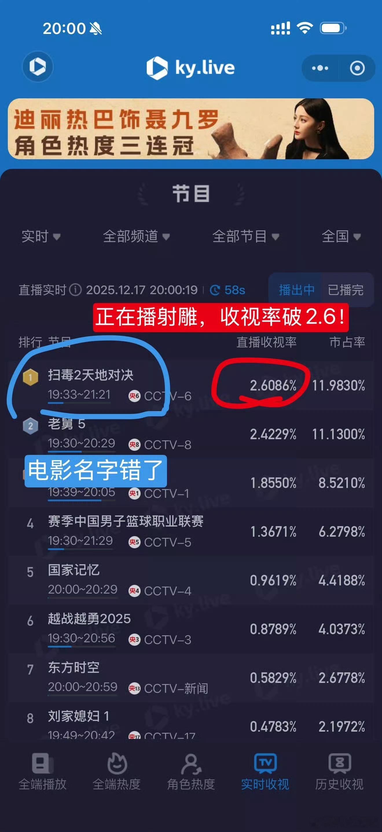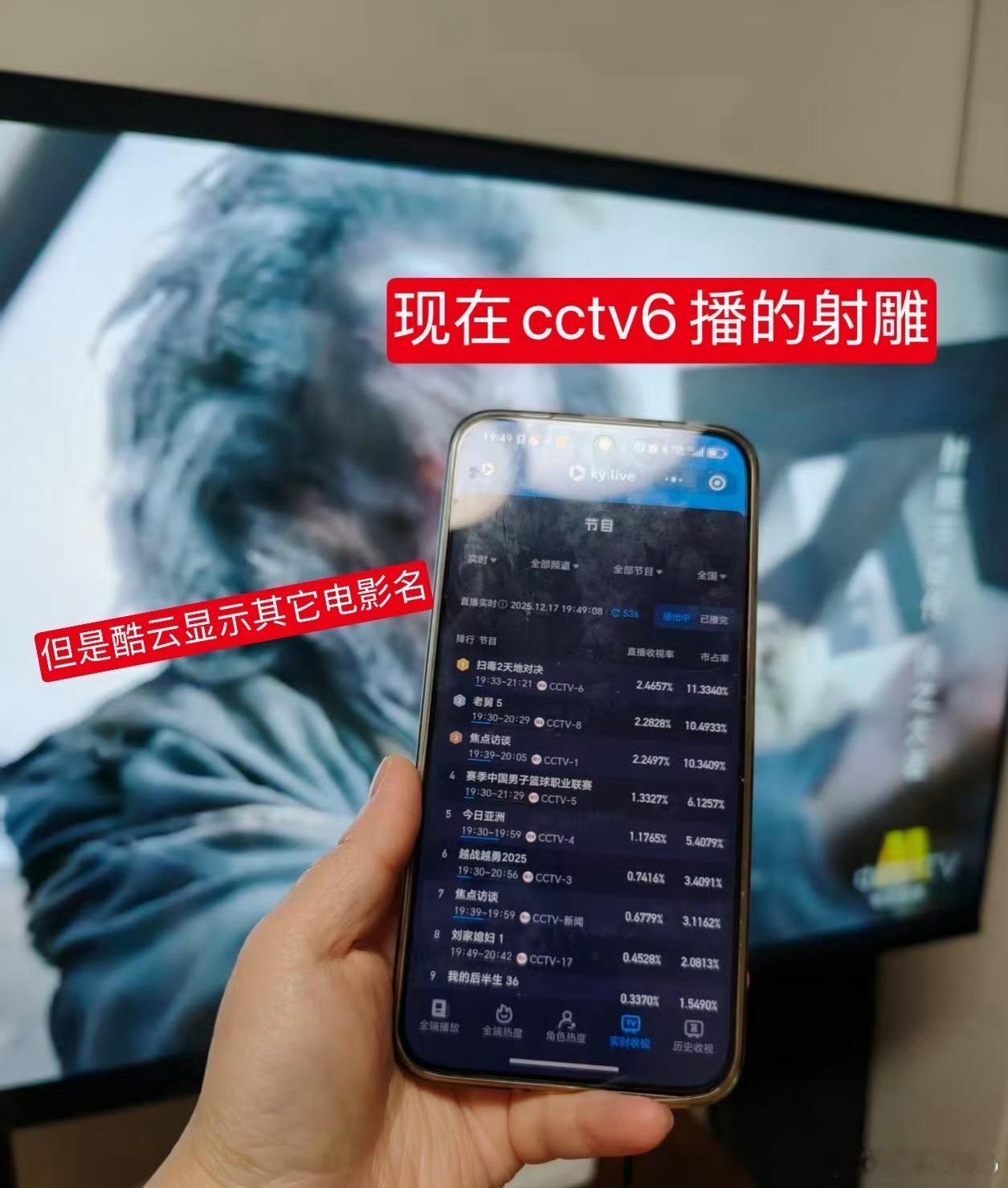 肖战《射雕英雄传侠之大者》今天在CCTV6播出,收视率破了2.6。但酷云把射雕打成了另一部电影的名字 这草台班子